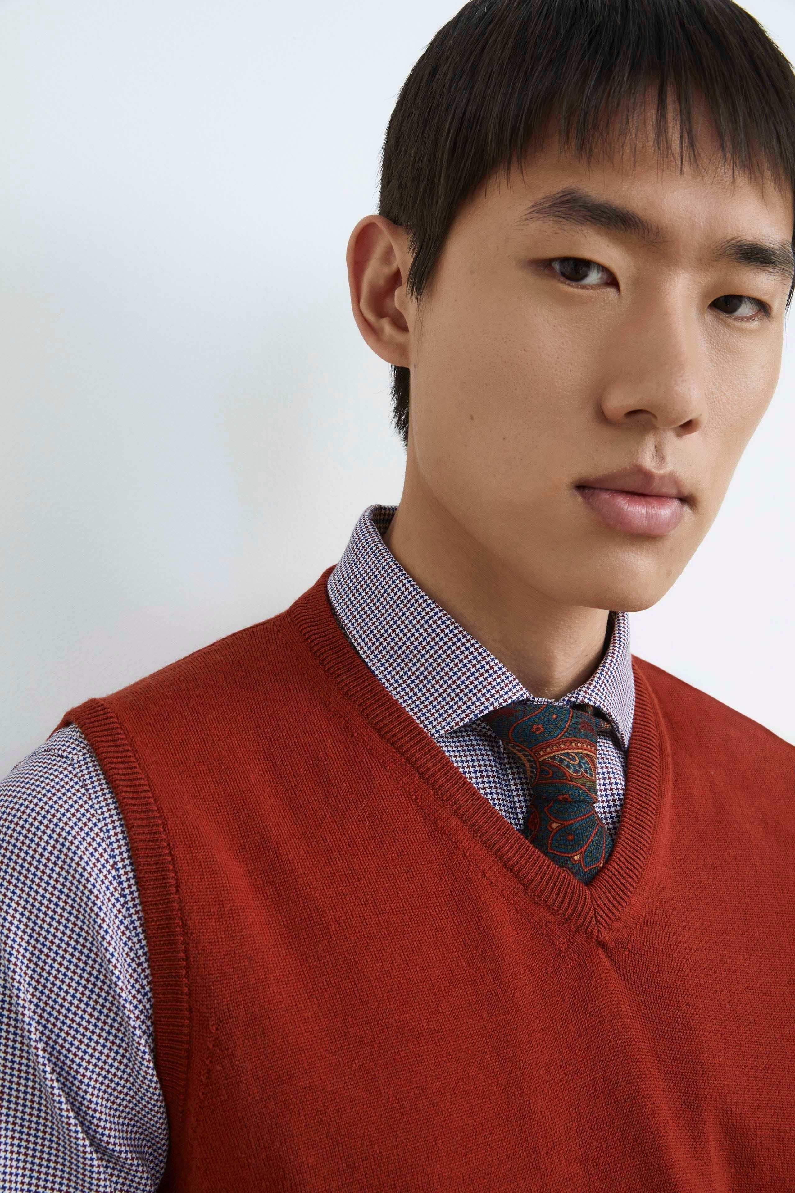 TERRAGilet scollo a V da uomo in pura lana merino extrafine. Bordi rimagliati e fondo a costine. Il trend dell’autunno inverno, realizzato in una fibra pregiata come la lana merino calda e avvolgente. Vestibilità regolare. Made in Italy. Il modello è alto 188 cm e indossa la taglia 50.