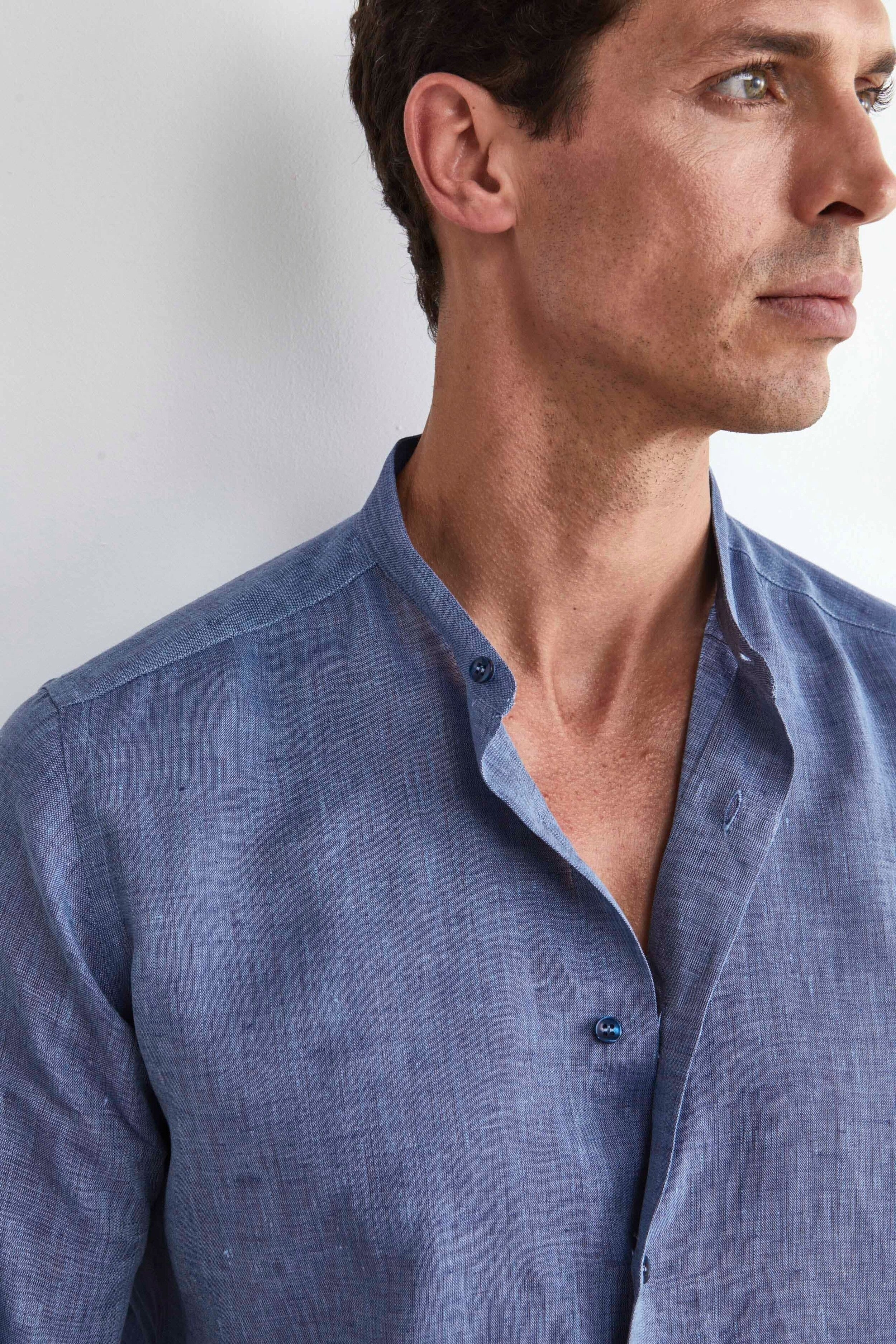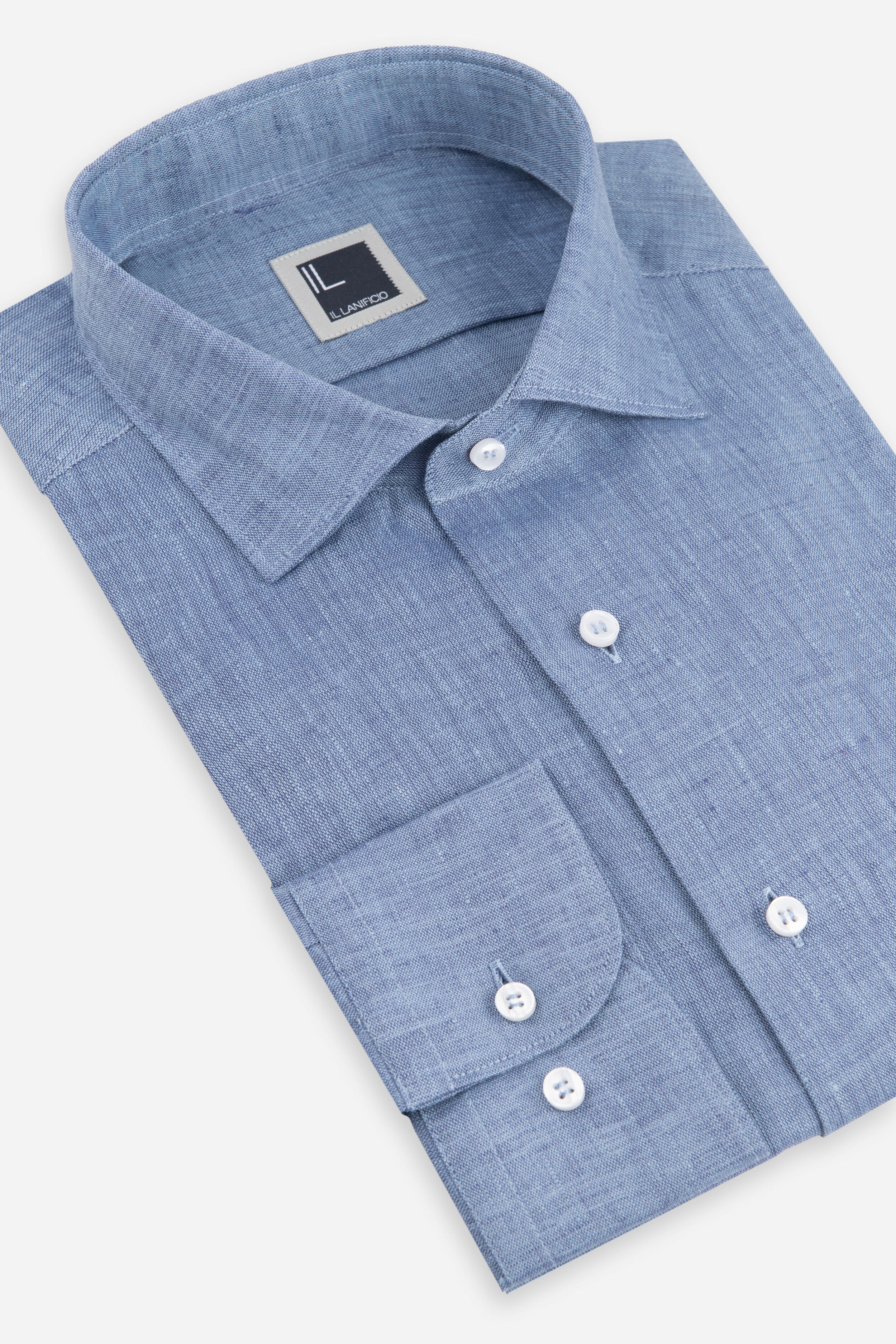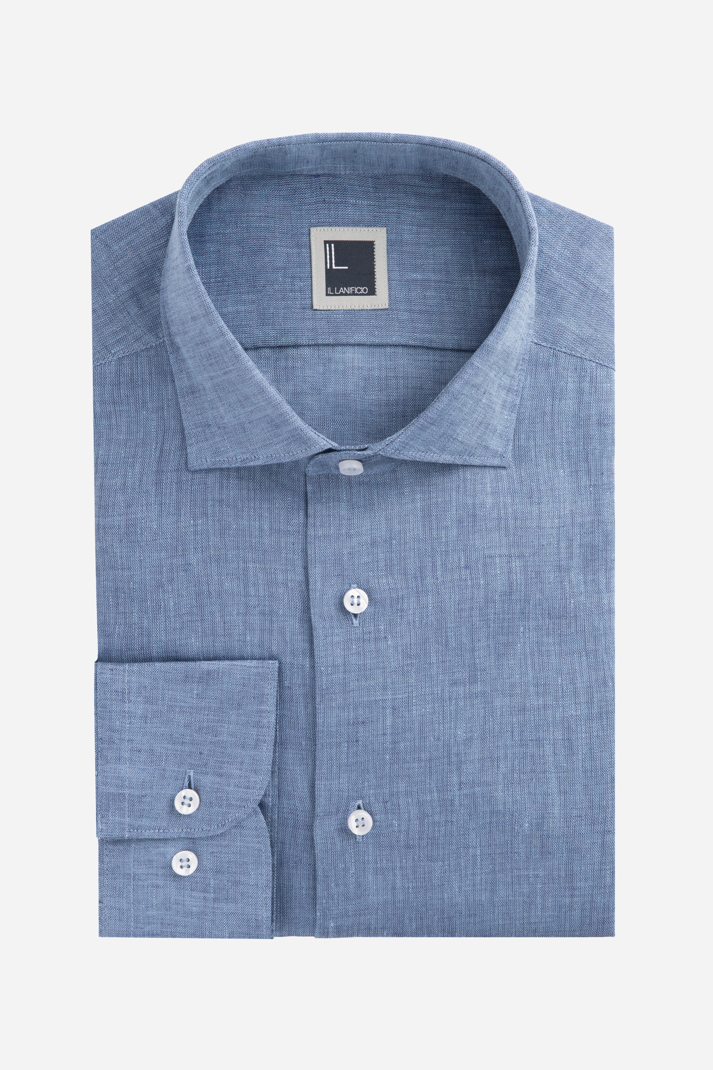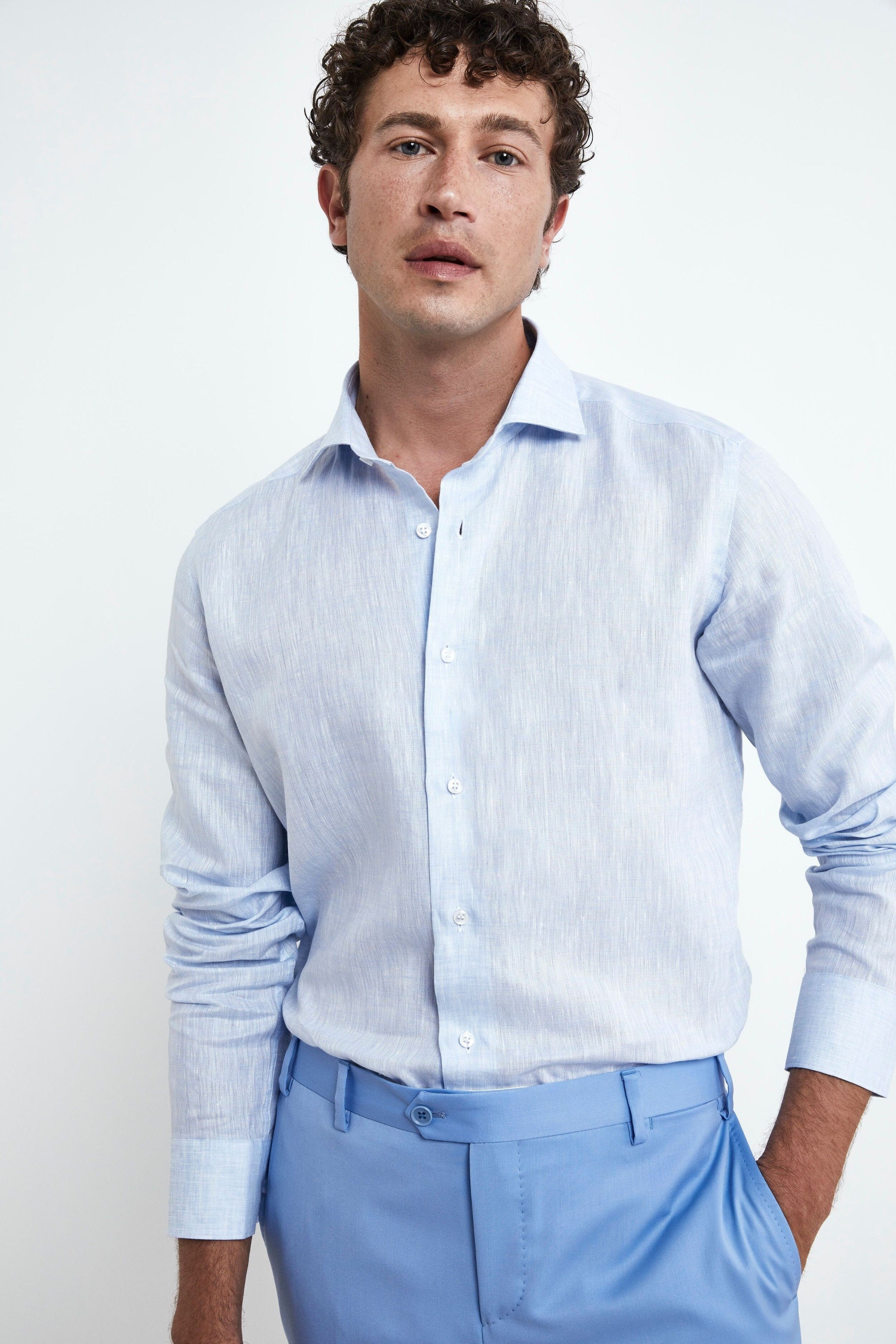 Camicia Lino Collo Francese con Taschino - RIGATO BIANCO/AZZURRO