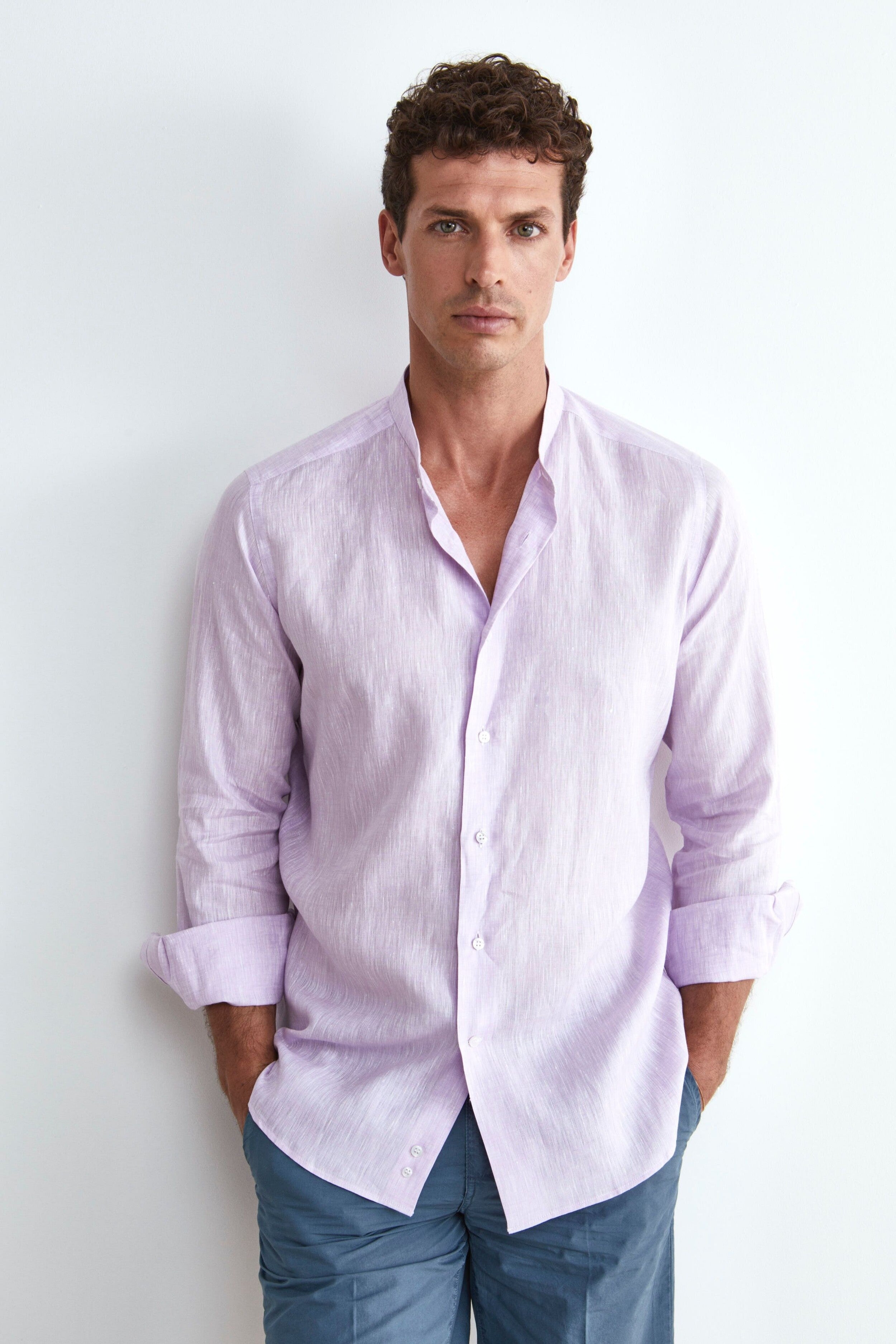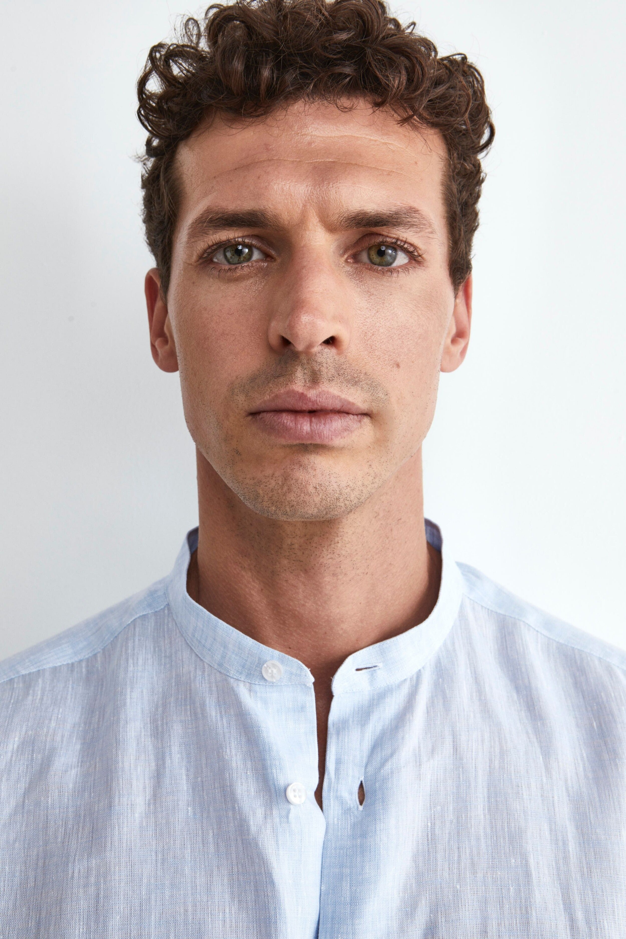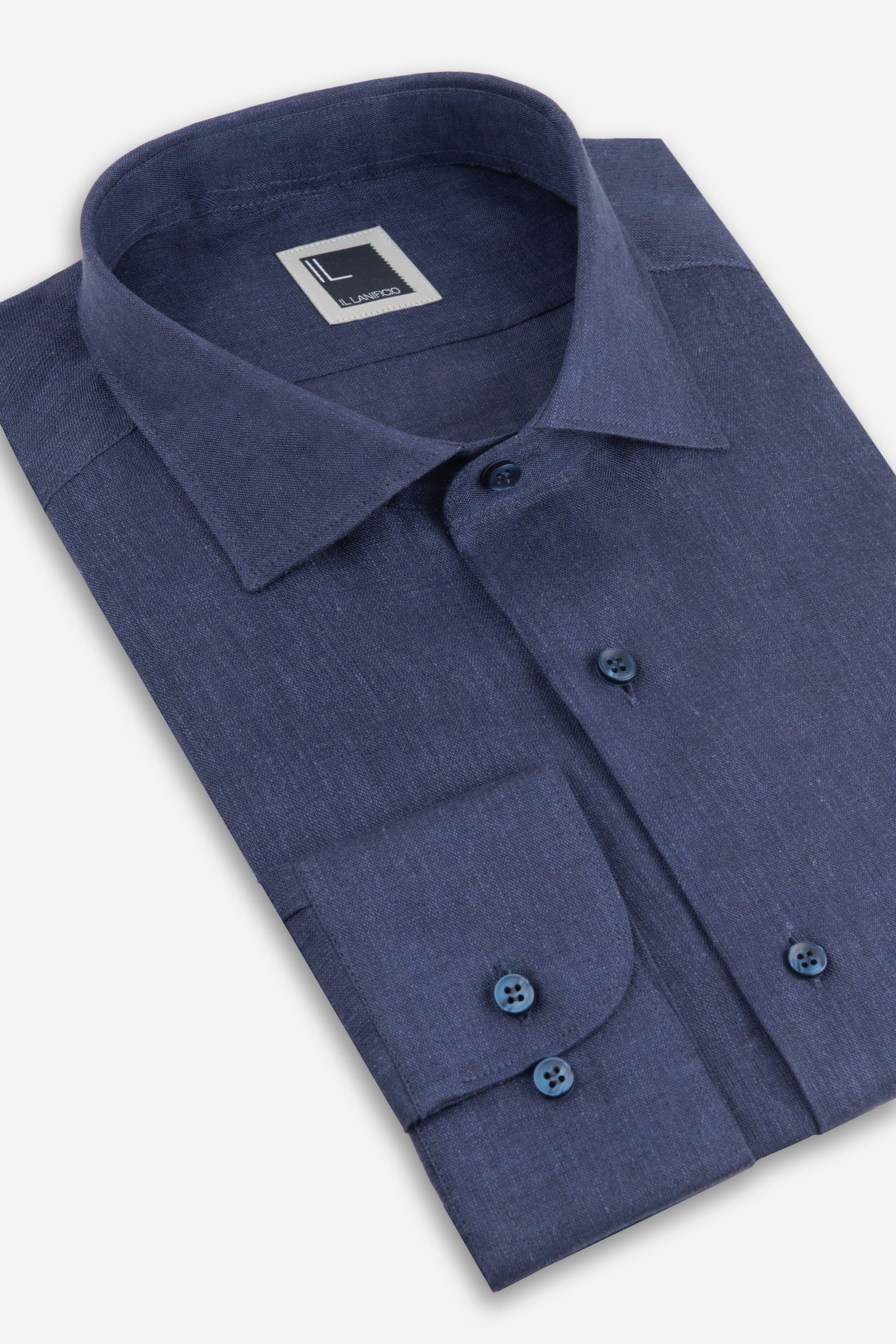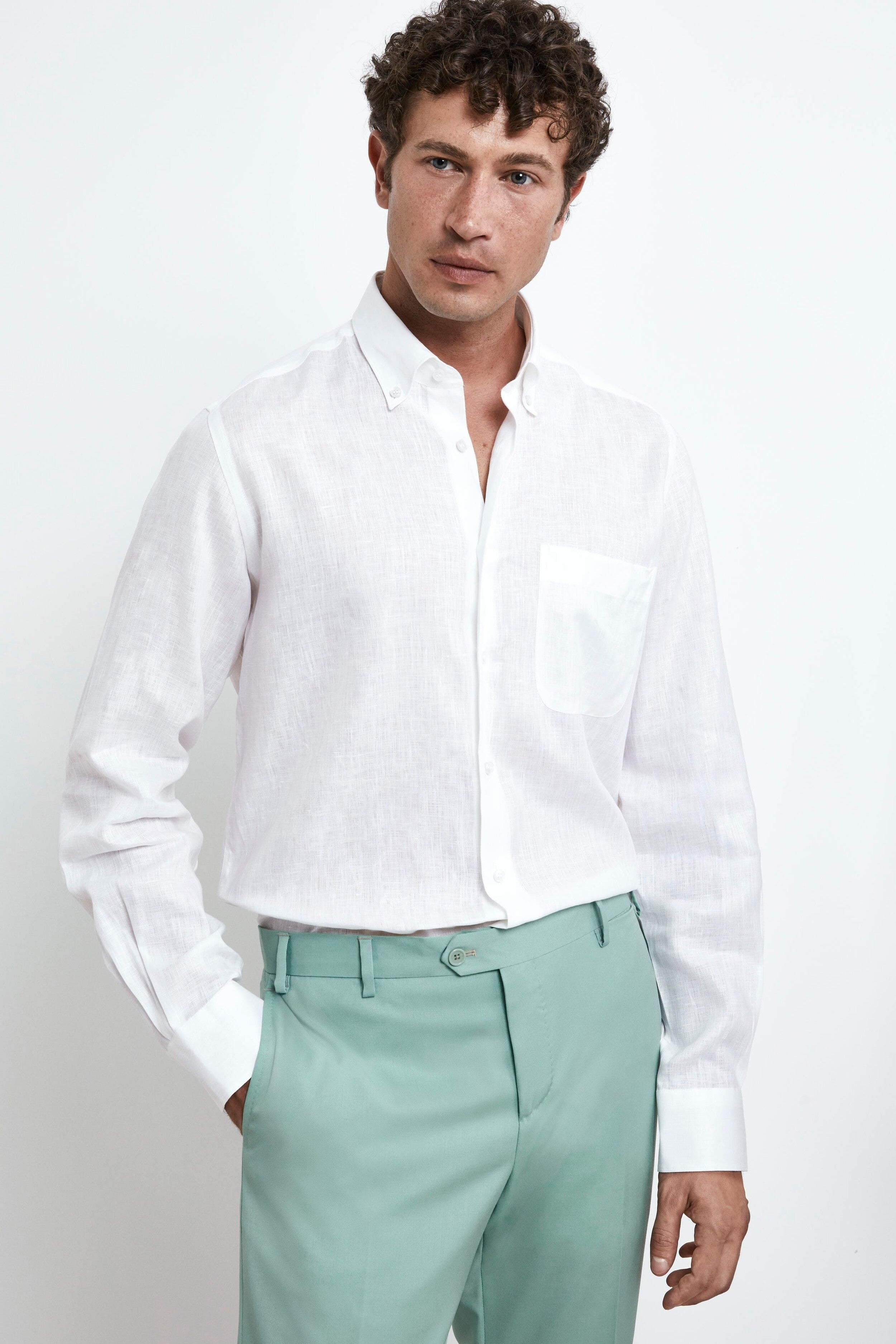 Camicia Lino Collo Francese con Taschino - RIGATO BIANCO/AZZURRO