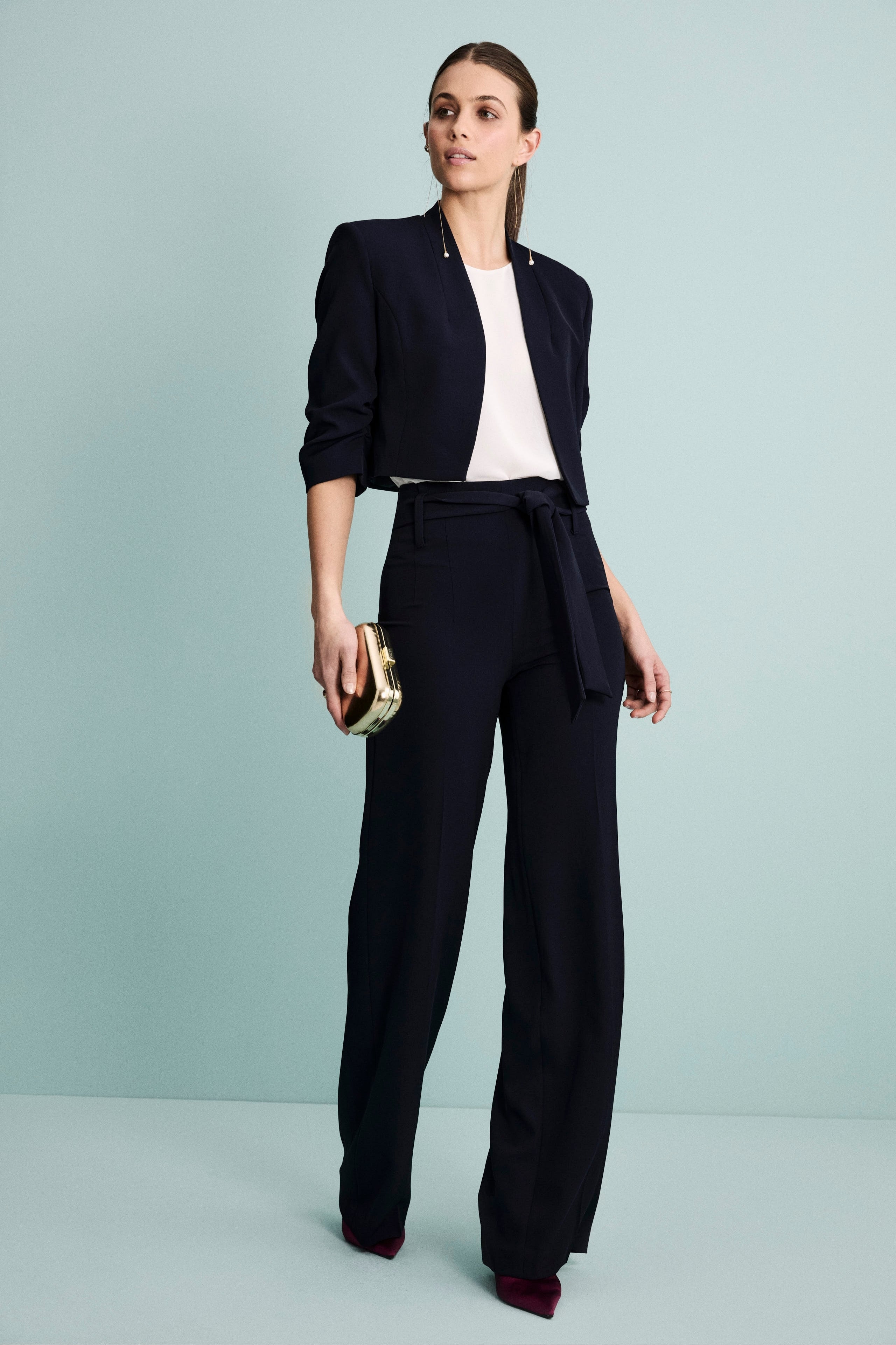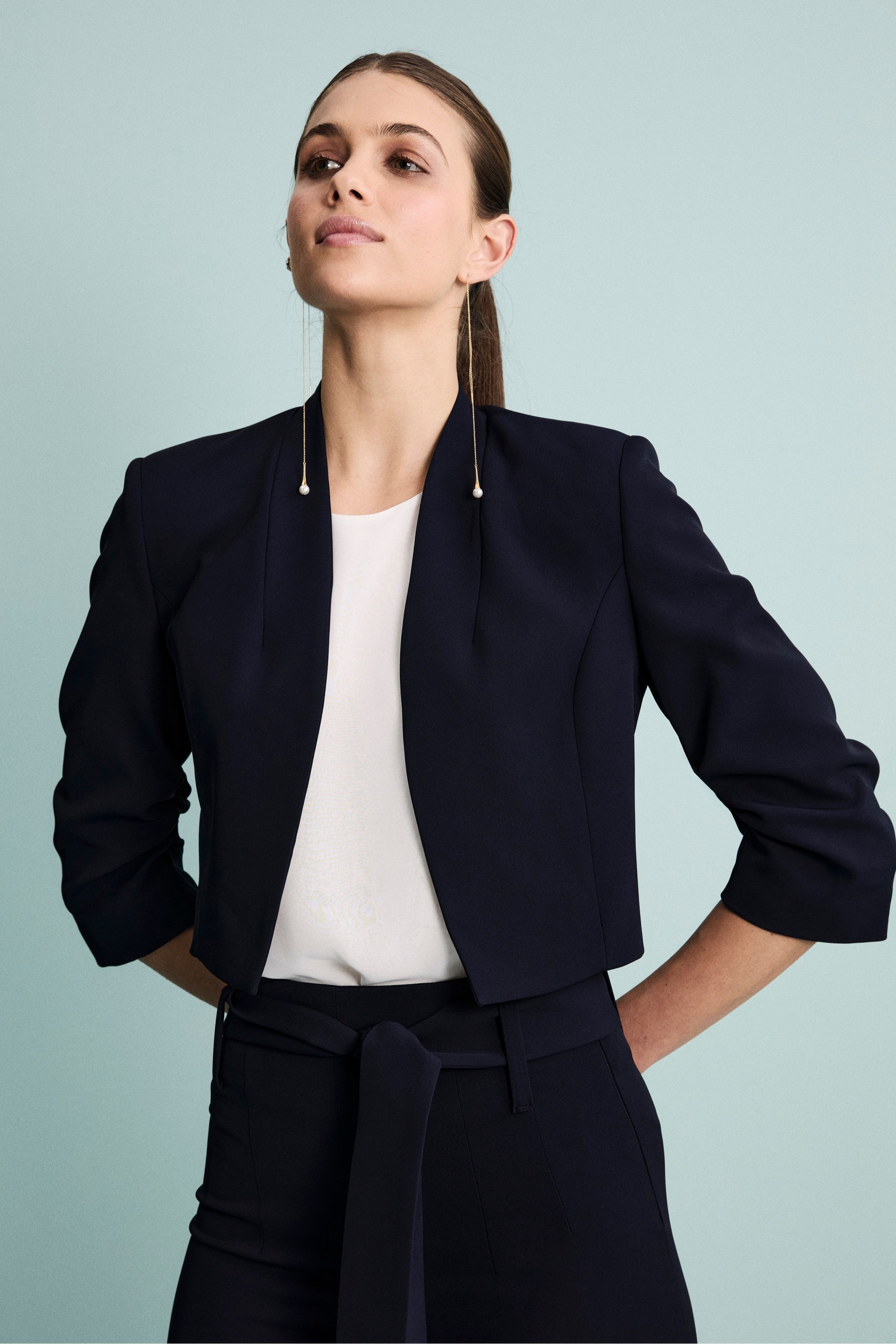 BLUBolero Elegante Foderato da donna, pensato per completare con stile i tuoi look da cerimonia. Realizzato in twill fluido, leggero e raffinato, presenta un design aperto con maniche 3/4 arricciate e una vestibilità regolare che valorizza ogni silhouette con raffinatezza. L’interno è completamente foderato per garantire comfort e finiture impeccabili. Interamente Made in Italy e parte della collezione IL Lanificio, questo bolero aperto da donna è ideale da abbinare al pantalone palazzo coordinato con fusciacca, per un completo sofisticato e armonioso, perfetto per cerimonie, eventi o occasioni speciali. La modella è alta 177 cm e indossa la taglia 42.