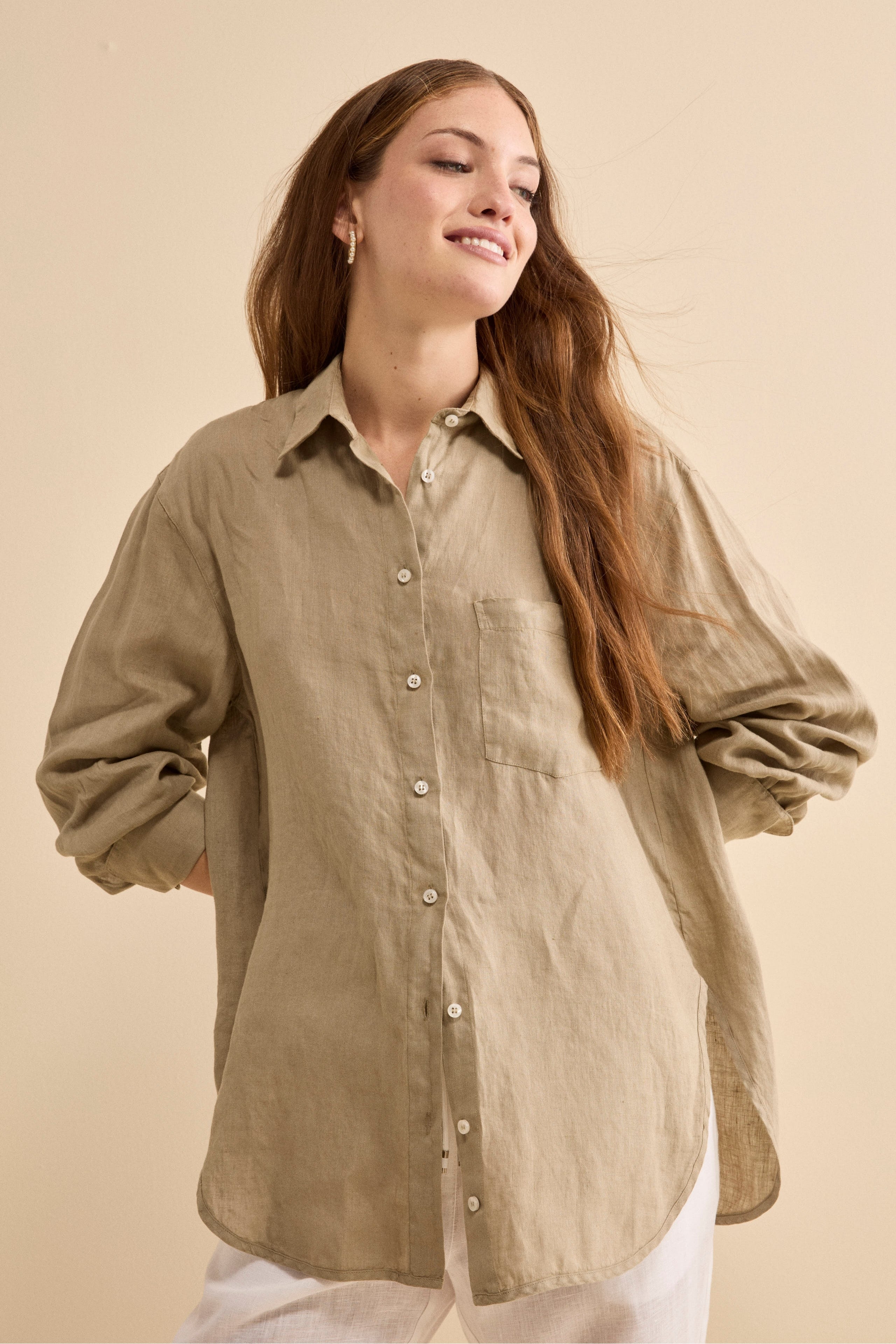 Semplice, fresca ed essenziale, questa Camicia Over in Lino con Taschino è un capo immancabile nel guardaroba estivo femminile. Realizzata in 100% lino tinto capo, presenta una silhouette over con lunghezza ai fianchi e spacchi laterali che aggiungono movimento e leggerezza. Il colletto classico, il taschino applicato sul petto e i polsini con bottone definiscono un’eleganza rilassata, perfetta per la stagione. La pinces posteriore ne valorizza il taglio, mentre la vestibilità comoda rende questa camicia ideale sia per l’ufficio che per il tempo libero. Indossala con un pantalone morbido in lino o con un bermuda a righe per look disinvolti e contemporanei. Parte della collezione IL Lanificio, questa camicia da donna è un capo versatile pensato per chi cerca stile naturale e qualità. La modella è alta 175 cm e indossa la taglia 42.