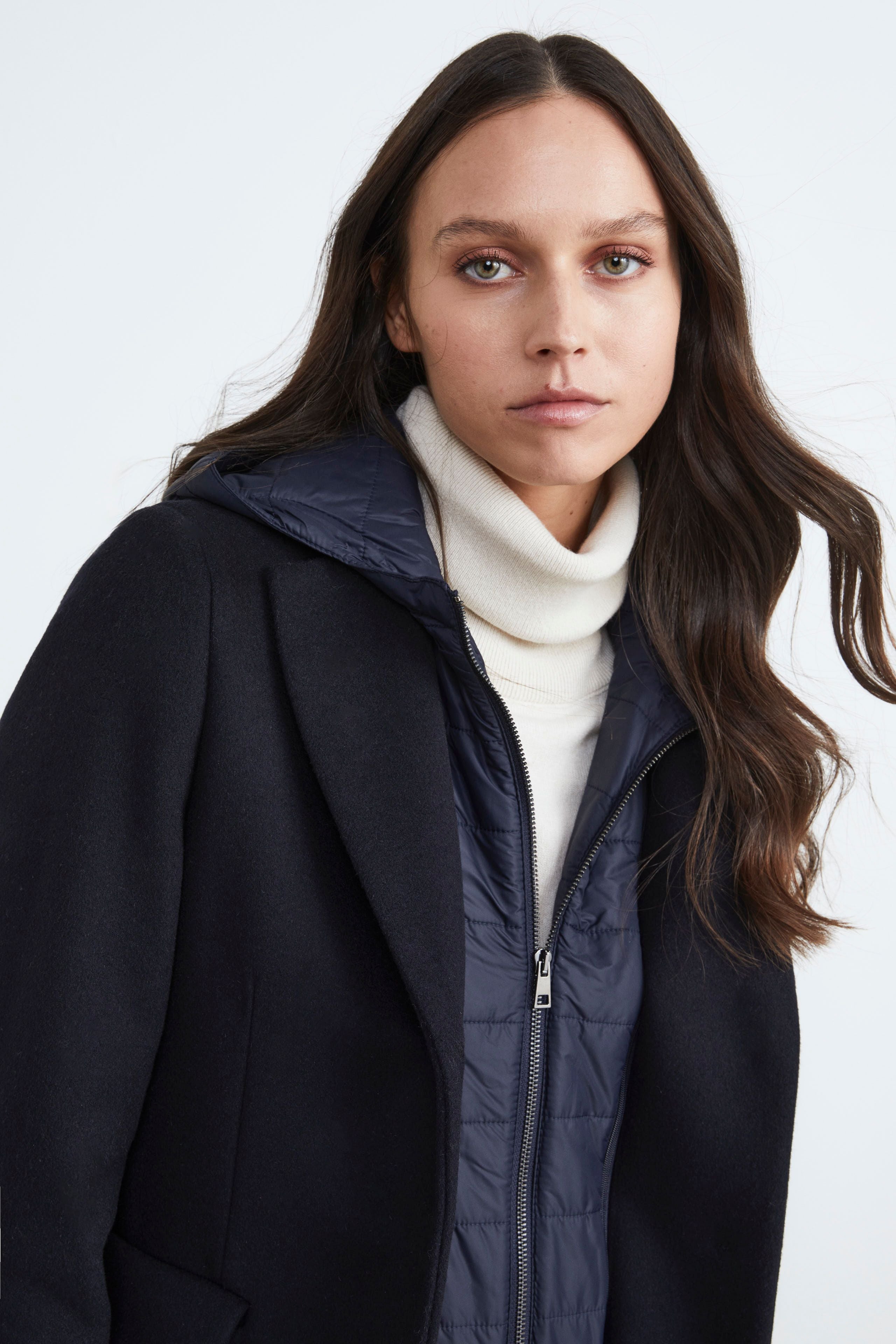 Cappotto da donna in misto lana e cashmere, vestibilità asciutta. Comprende una fodera interna con cappuccio removibile e presenta una chiusura monopetto con tre bottoni e tasche a filetto con pattina. Lunghezza media. Indossalo con un caldo dolcevita in cashmere per il massimo della morbidezza. Disponibile in più varianti colore e made in Italy. La modella è alta 178 cm e indossa la taglia 40.