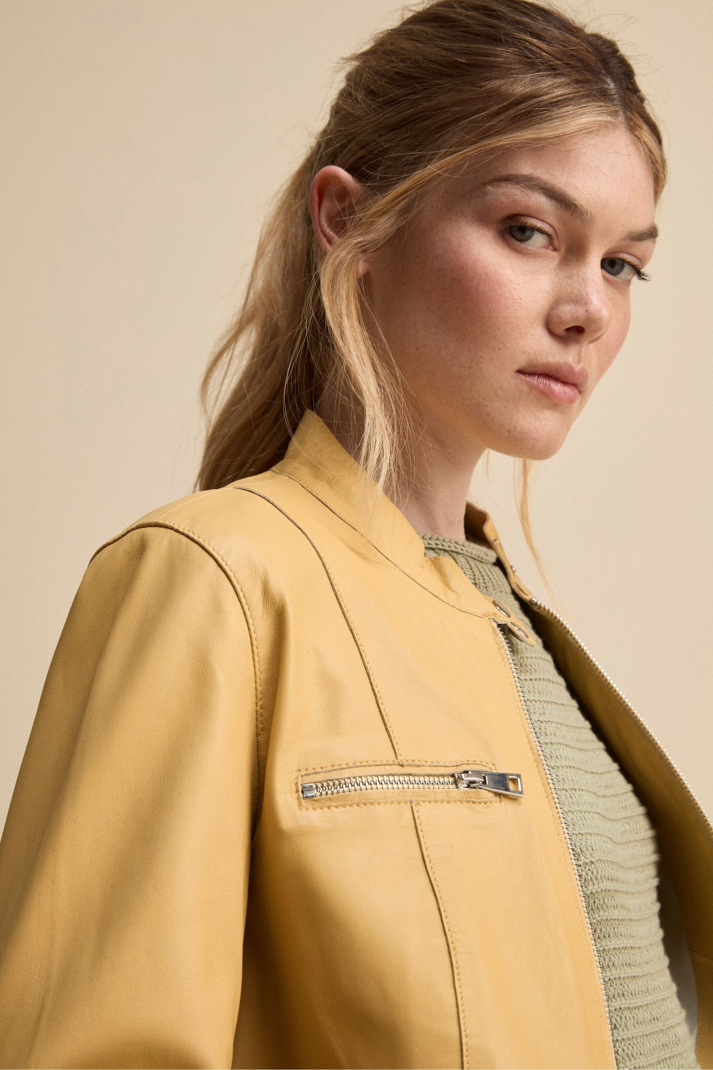 Giacca di Pelle Coreana con Zip, il capo perfetto per chi desidera un look moderno e raffinato. Realizzata in 100% pelle di agnello, garantisce morbidezza e qualità eccellente, mentre la chiusura frontale con zip e le tasche sul petto con zip aggiungono funzionalità e carattere. Dotata di colletto coreano e polsini con bottoni a pressione, questa giacca offre una vestibilità regolare confortevole. I cinturini sul fondo consentono di regolare la silhouette, per un tocco personalizzato di stile. Interamente foderata, è ideale per affrontare le mezze stagioni con classe e praticità. Parte della collezione IL Lanificio, questo capo incarna l’alta artigianalità italiana, unendo design contemporaneo e cura dei dettagli. La modella è alta 170 cm e indossa la taglia .