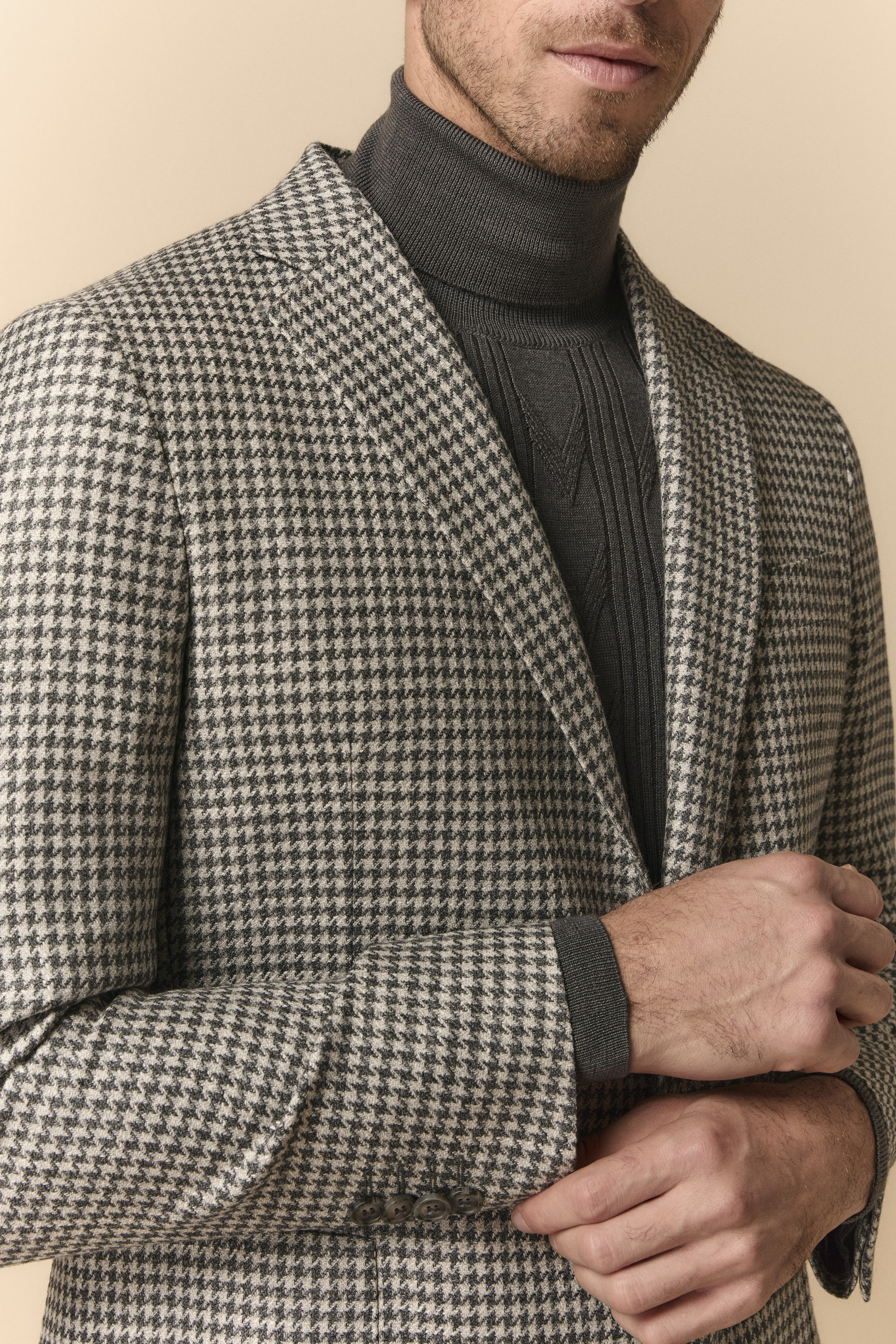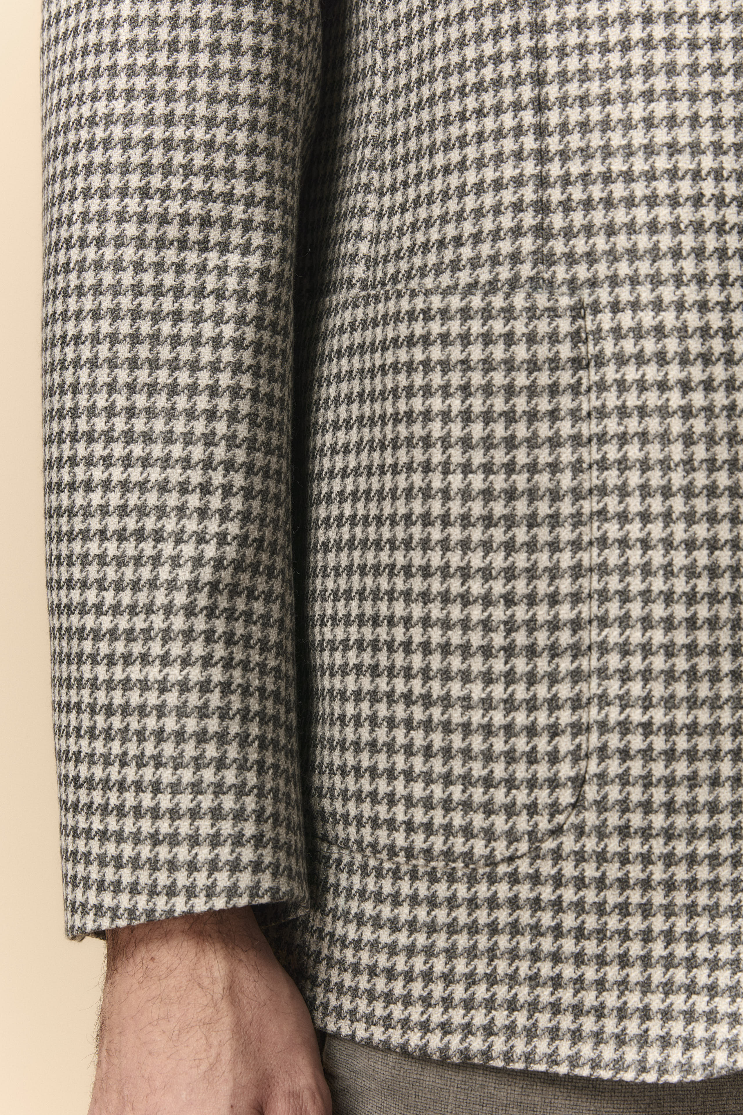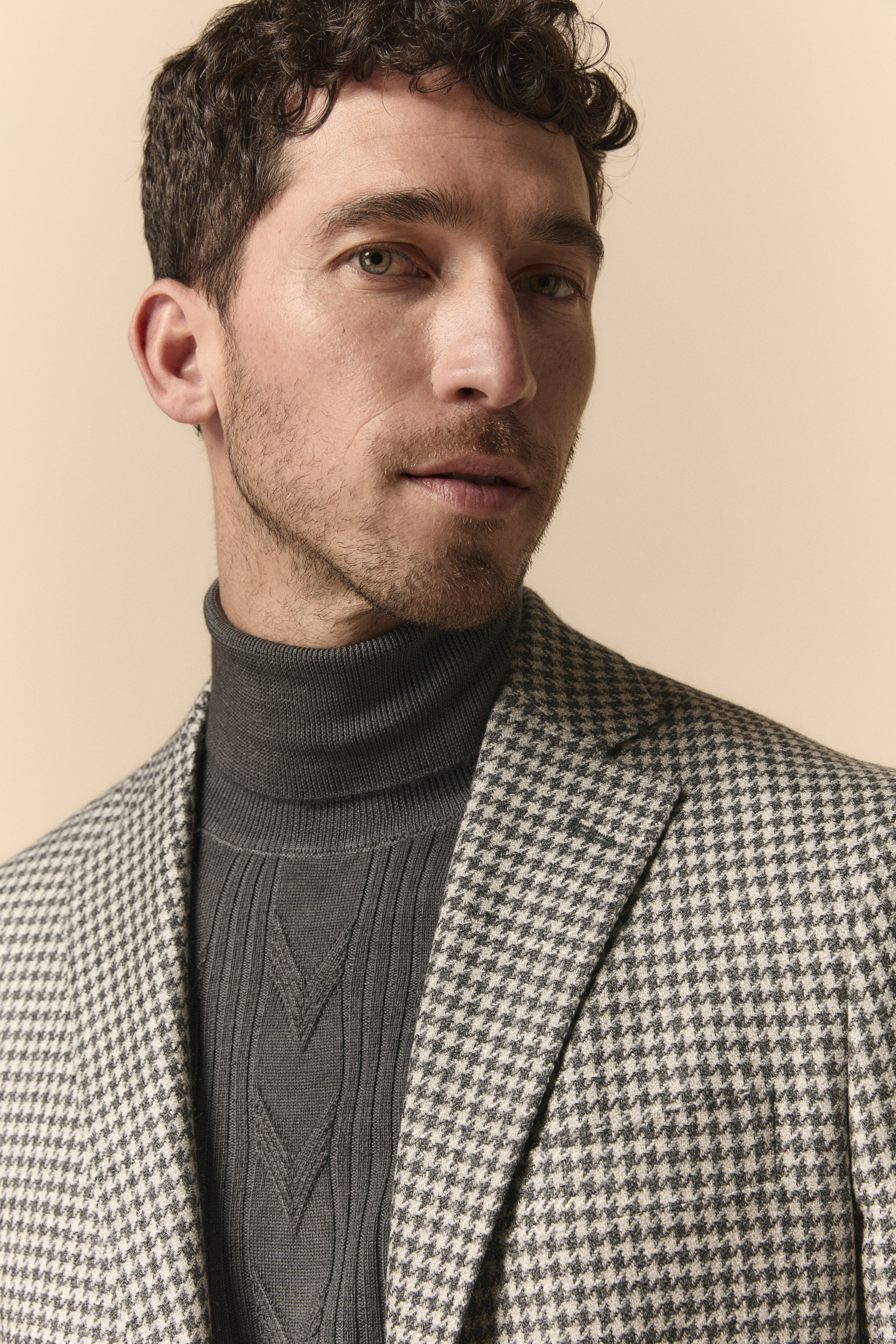 P/POULE GRIGIOEleganza senza tempo e qualità artigianale si uniscono nella giacca fantasia in lana e seta da uomo, realizzata con tessuto pregiato del Lanificio F.lli Cerruti dal 1881. Il raffinato motivo pied de poule conferisce al capo uno stile classico e sofisticato, ideale per l’uomo moderno. Questa giacca è caratterizzata da un revers classico, una chiusura frontale a 2 bottoni e dettagli sartoriali come le tasche applicate e il taschino a taglio sul petto. Foderata solo nelle maniche per una maggiore leggerezza e comfort, presenta un doppio spacco posteriore per garantire libertà di movimento. Con una vestibilità regolare, tipica del drop 6, si adatta perfettamente a ogni silhouette, rendendola versatile per diverse occasioni, dal lavoro agli eventi formali. Scegli la giacca fantasia in lana e seta per un capo esclusivo e intramontabile, che unisce la tradizione sartoriale italiana a un design contemporaneo. Made in Italy. Il modello è alto 189 cm e indossa la taglia 50.