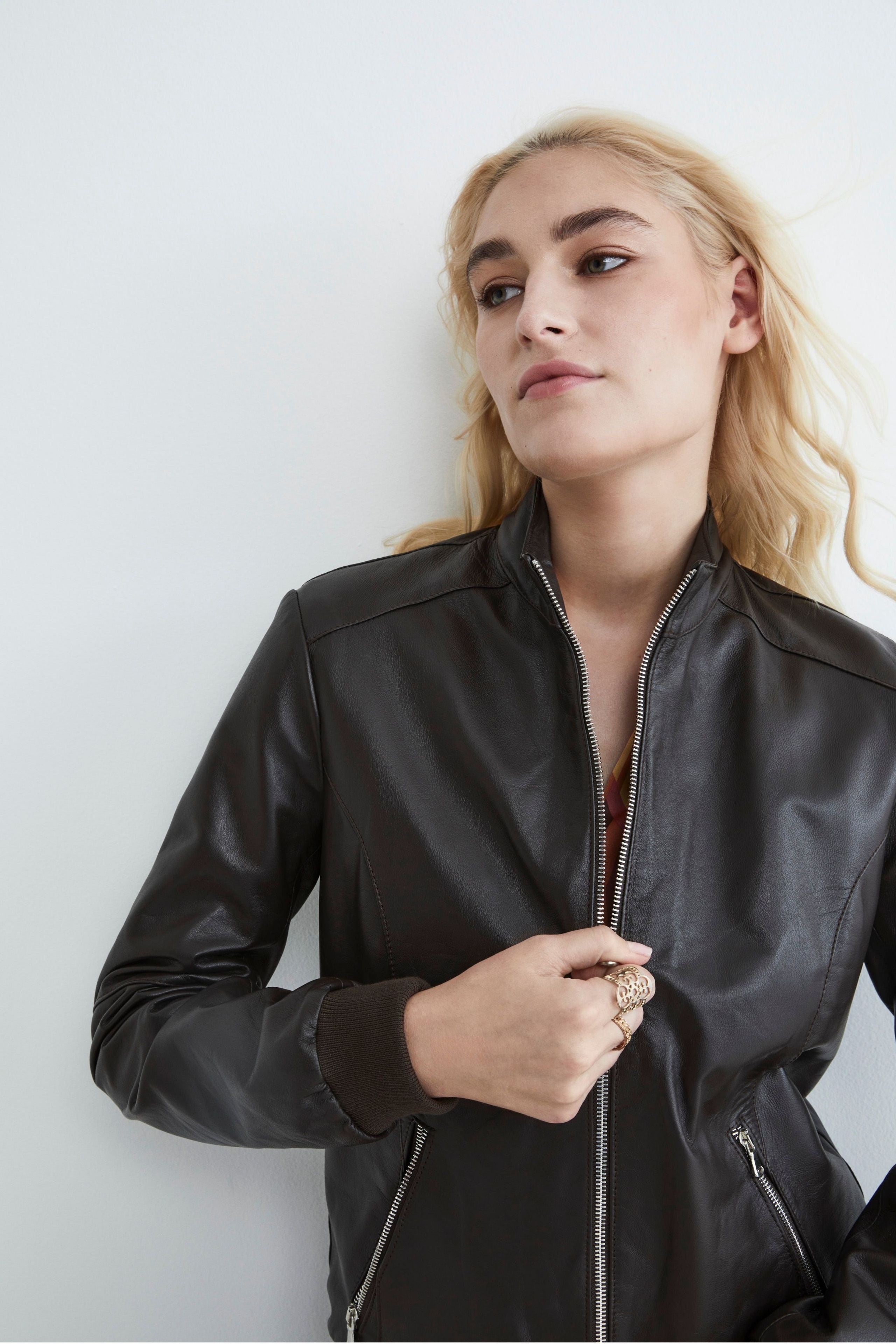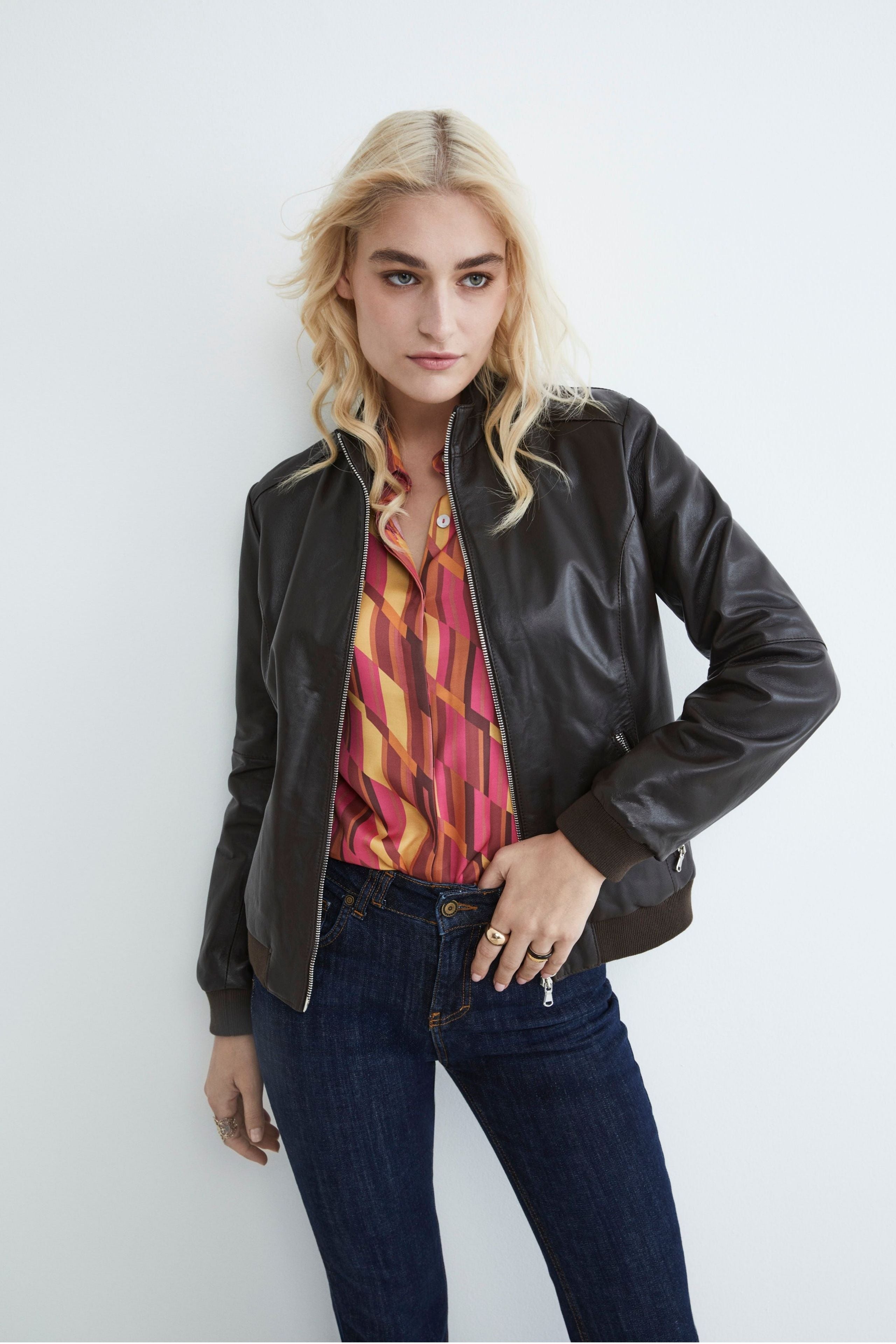 T.MOROGiacca di pelle da donna modello con collo alla coreana. Disponibile nella colorazione testa di moro, è caratterizzata da bordi in maglia, tasche laterali e chiusura frontale con cerniera. Indossala con la camicia fantasia e il jeans a zampa Il Lanificio per un look retrò anni 70. La modella è alta 174 cm e indossa la taglia 40. Vestibilità regolare e made in Italy.
