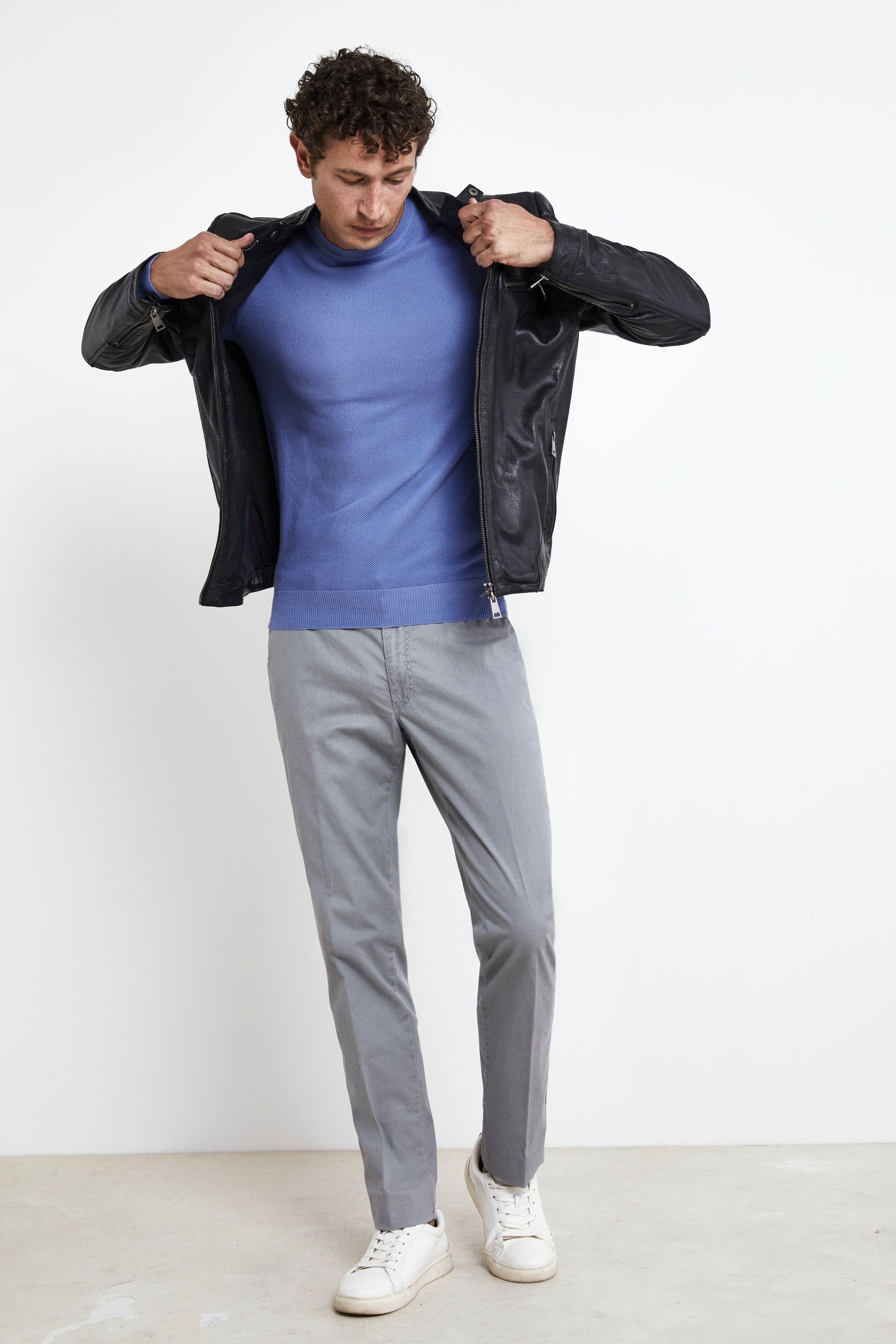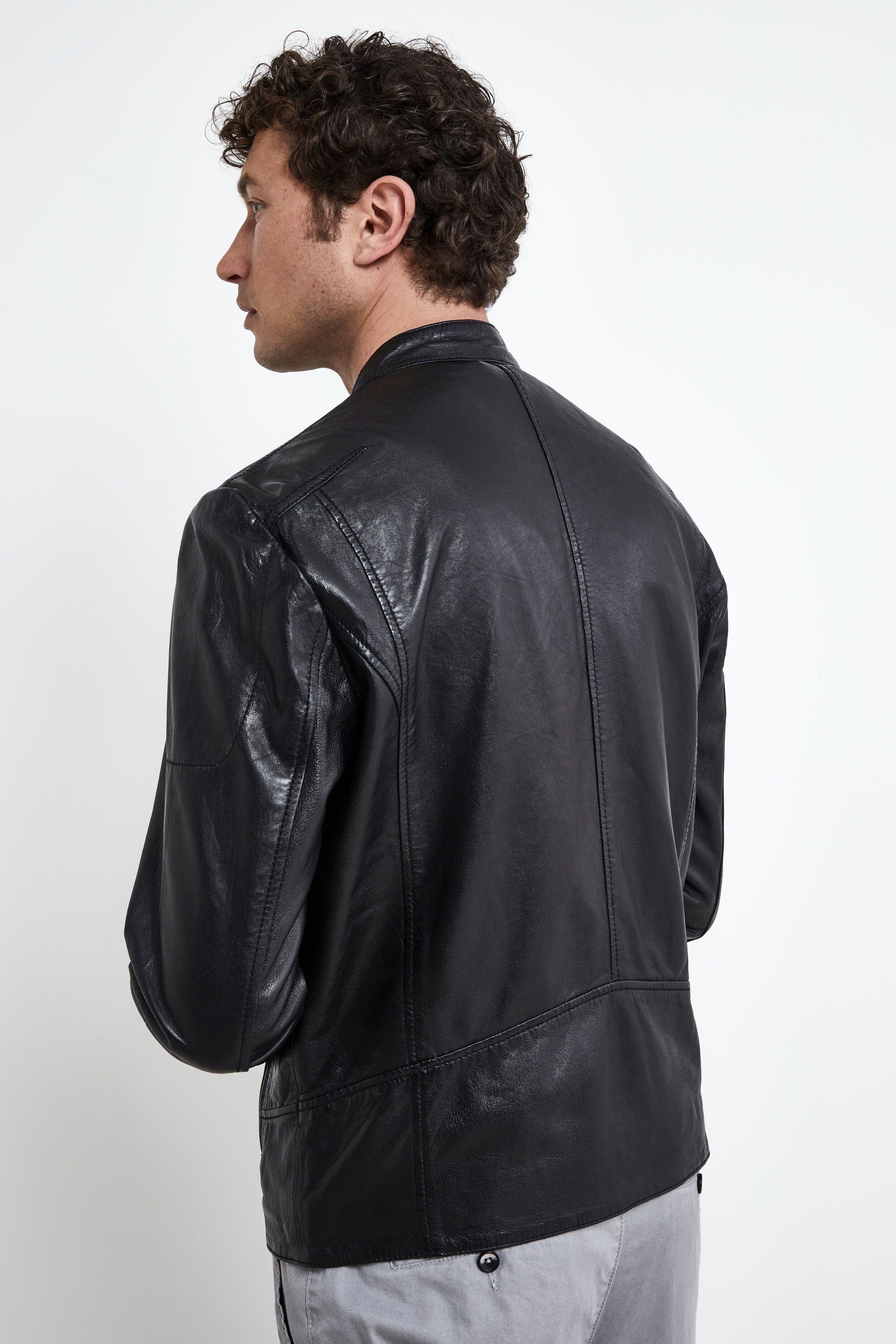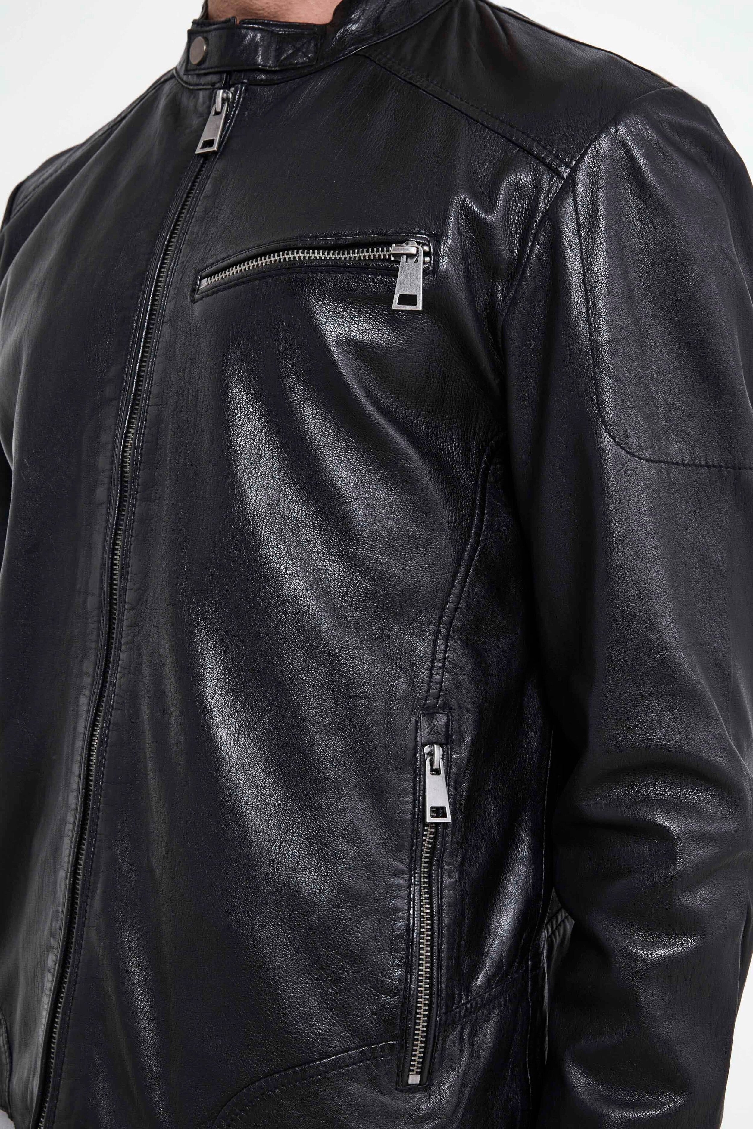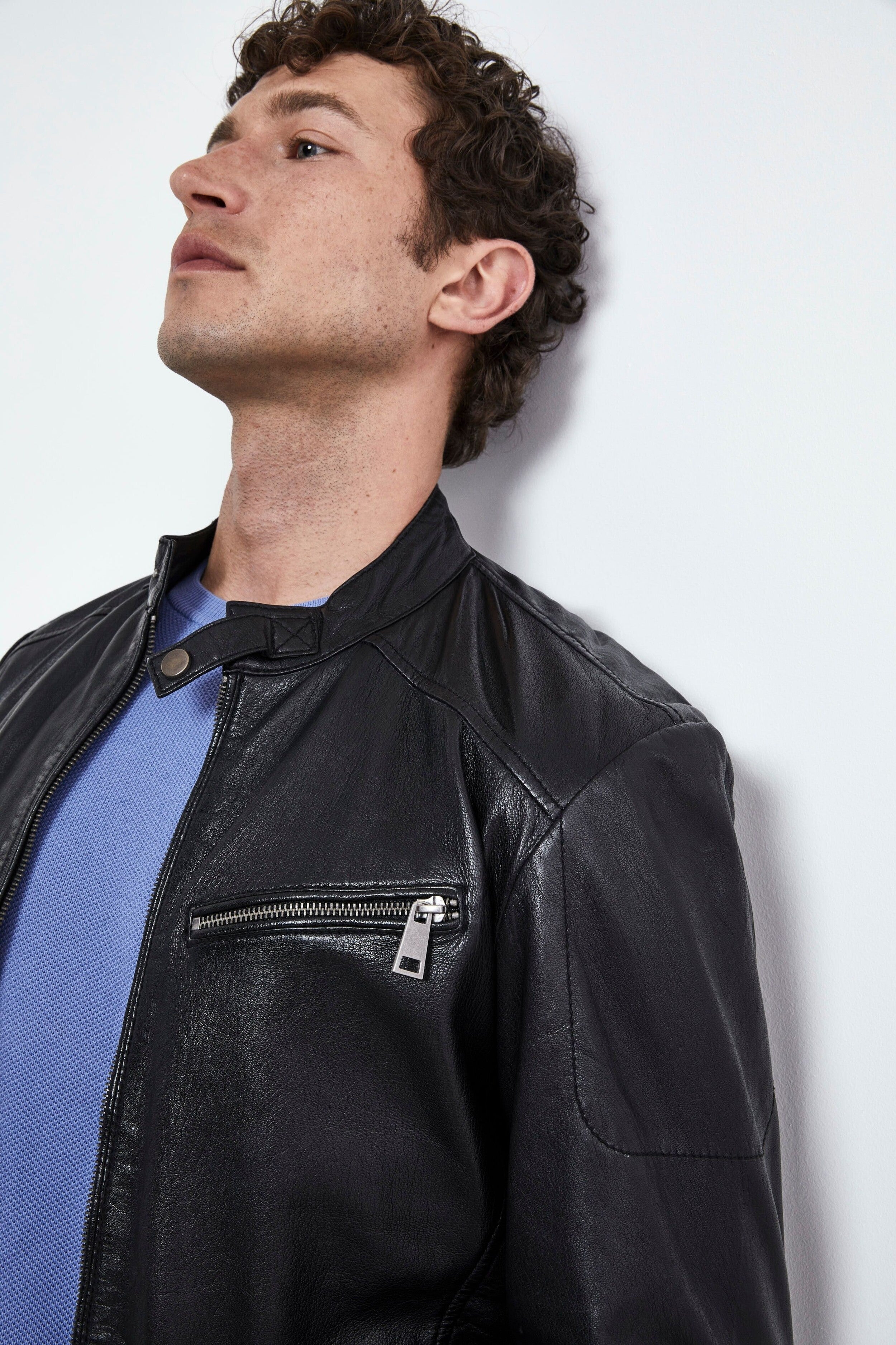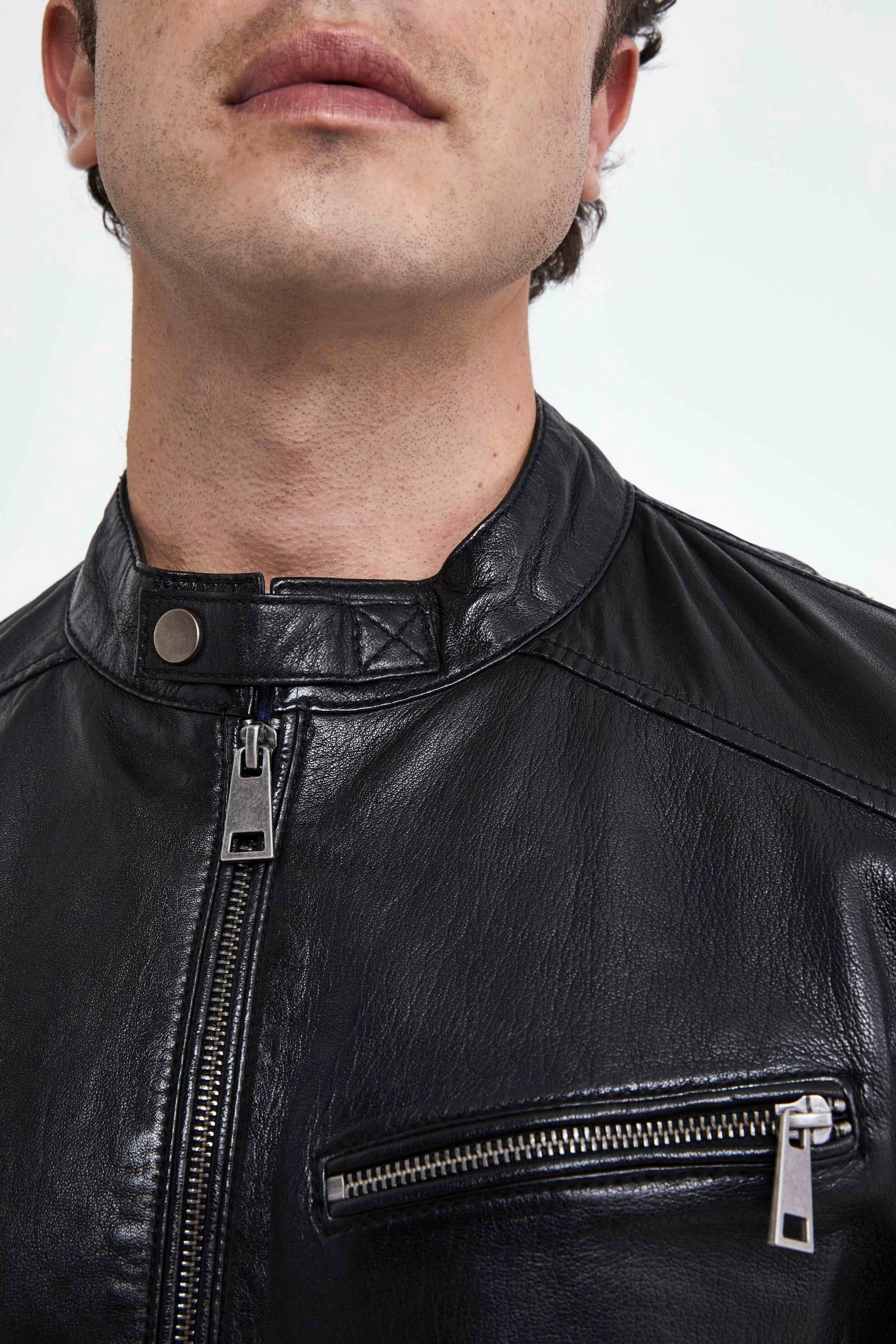 NEROGiubbotto di pelle da uomo con collo alla coreana, chiusura con zip frontale, taschino sul petto e tasche con cerniera laterali. Che tu stia sfrecciando per le strade della città o dando un tocco di grinta al tuo outfit serale, il nostro giubbotto di pelle sarà sempre il tuo compagno di fiducia. Completa il look con un pullover in cotone e un denim Il Lanificio. Vestibilità slim. Il modello è alto 1.86 cm e indossa la taglia 50.