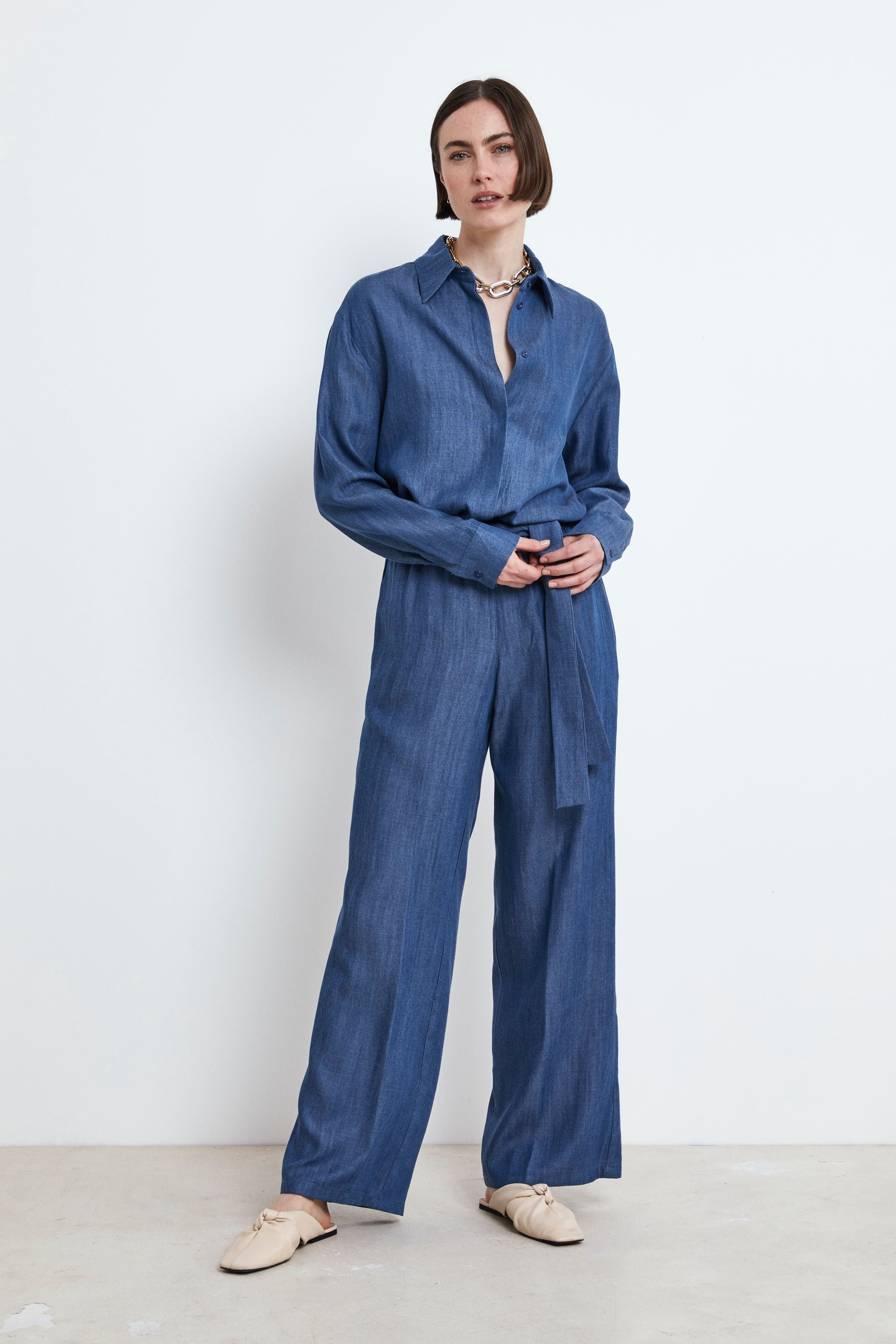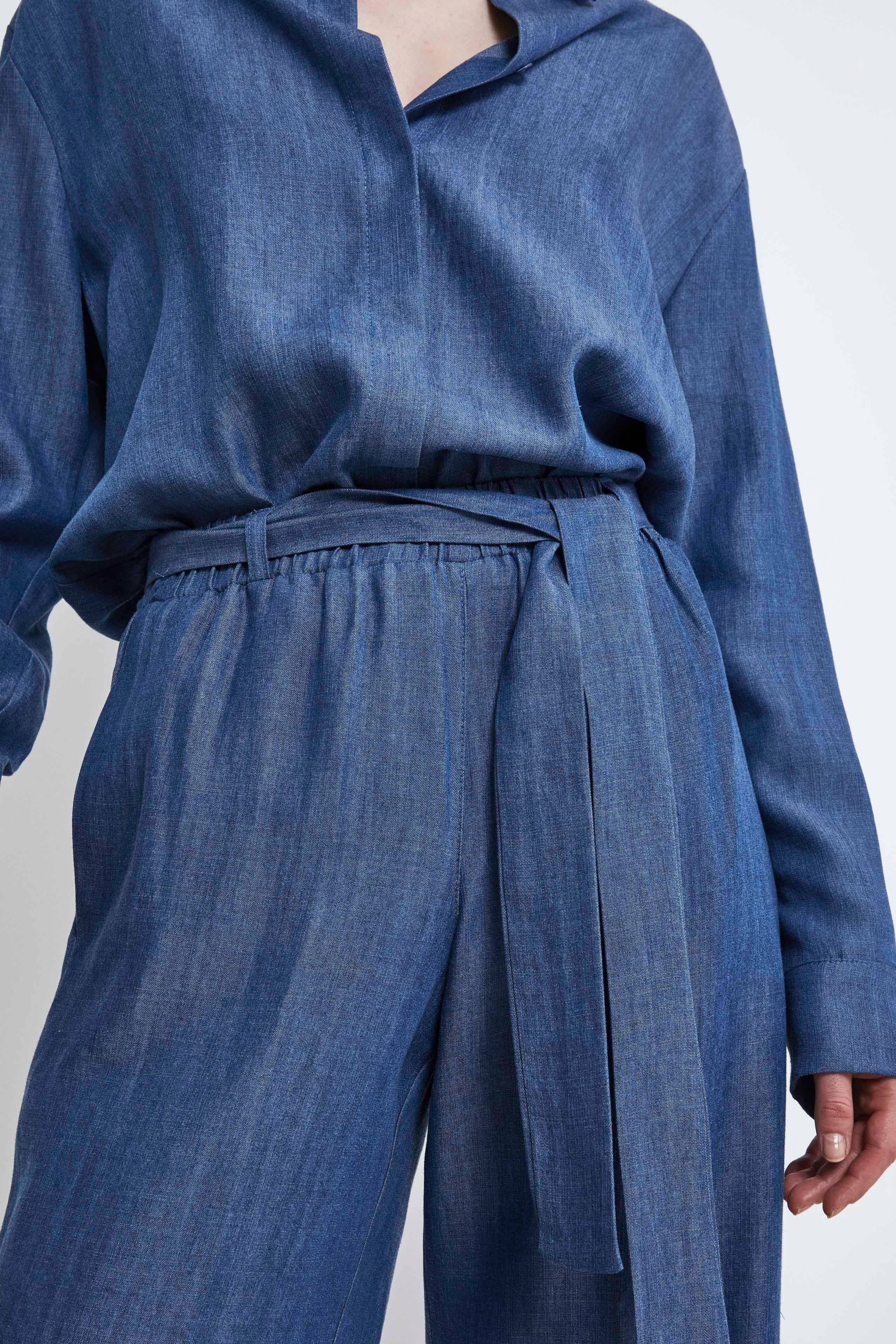 BLUPantalone a palazzo da donna con fusciacca in vita e comode tasche america. Vestibilità morbida. Indossa il nostro pantalone denim a palazzo e lasciati conquistare dal suo mix di raffinatezza e comfort. Perfetto per un look sofisticato al lavoro o per un outfit elegante nelle serate speciali, questo pantalone sarà il tuo capo preferito per un’eleganza senza sforzo. Completa l’outfit con una t-shirt o blusa Il Lanificio. Made in Italy. La modella è alta 175 cm e indossa la taglia 40.