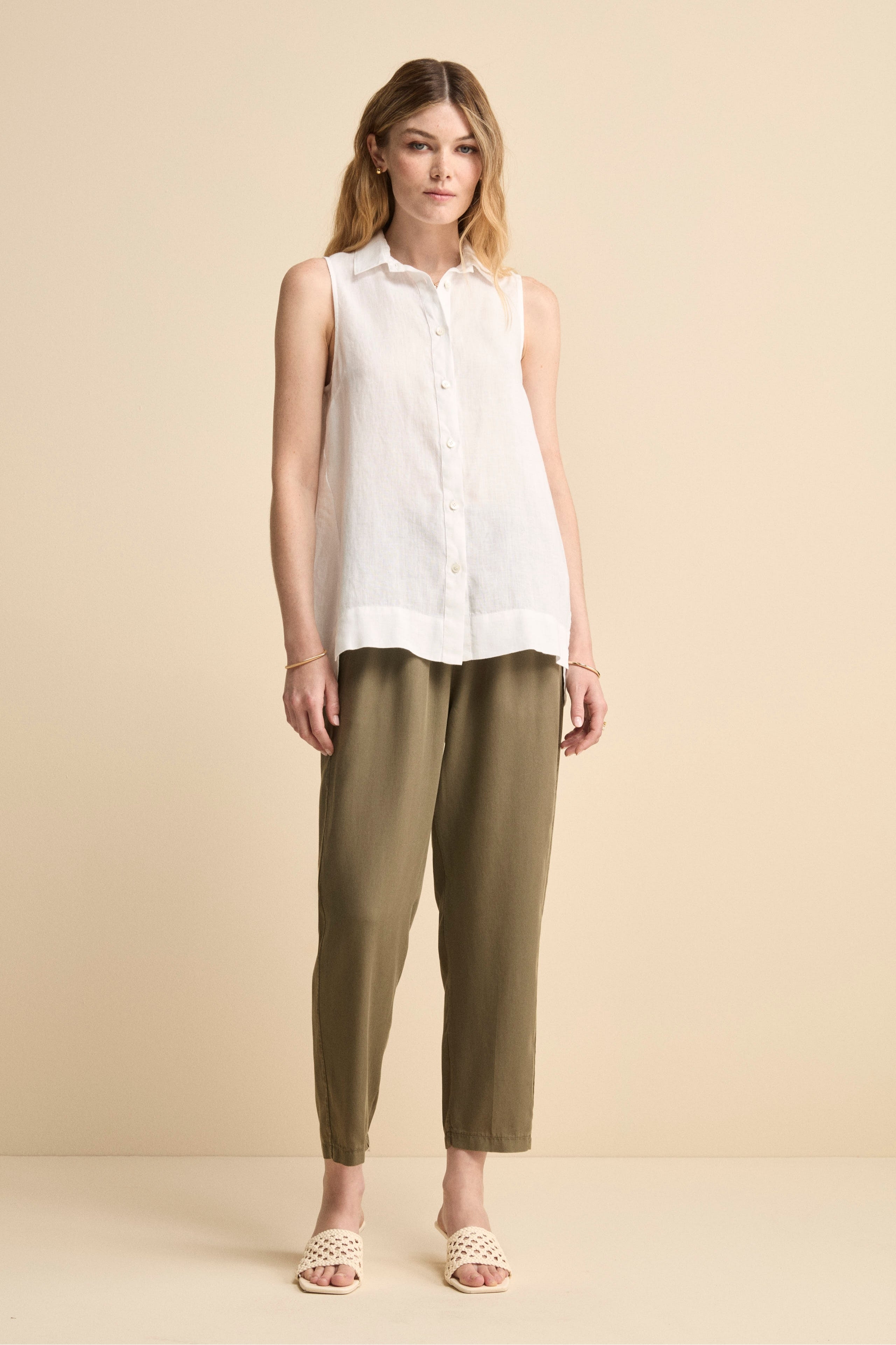 VERDE MILITAREVersatile, fluido e naturalmente elegante, questo pantalone da donna è realizzato in Tencel, una fibra apprezzata per la sua morbidezza, traspirabilità e leggerezza al tatto. Il design essenziale presenta una vita elasticizzata con passanti per cintura, pratiche tasche america e una vestibilità morbida che valorizza ogni silhouette con comfort e femminilità. Ideale per la stagione calda, è perfetto sia per il tempo libero che per un look da ufficio rilassato. Abbinalo a una camicia in lino o a un top elegante della collezione IL Lanificio per creare outfit sofisticati ma naturali, adatti anche a contesti formali o cerimonie estive. Made in Italy. La modella è alta 170 cm e indossa la taglia 40.