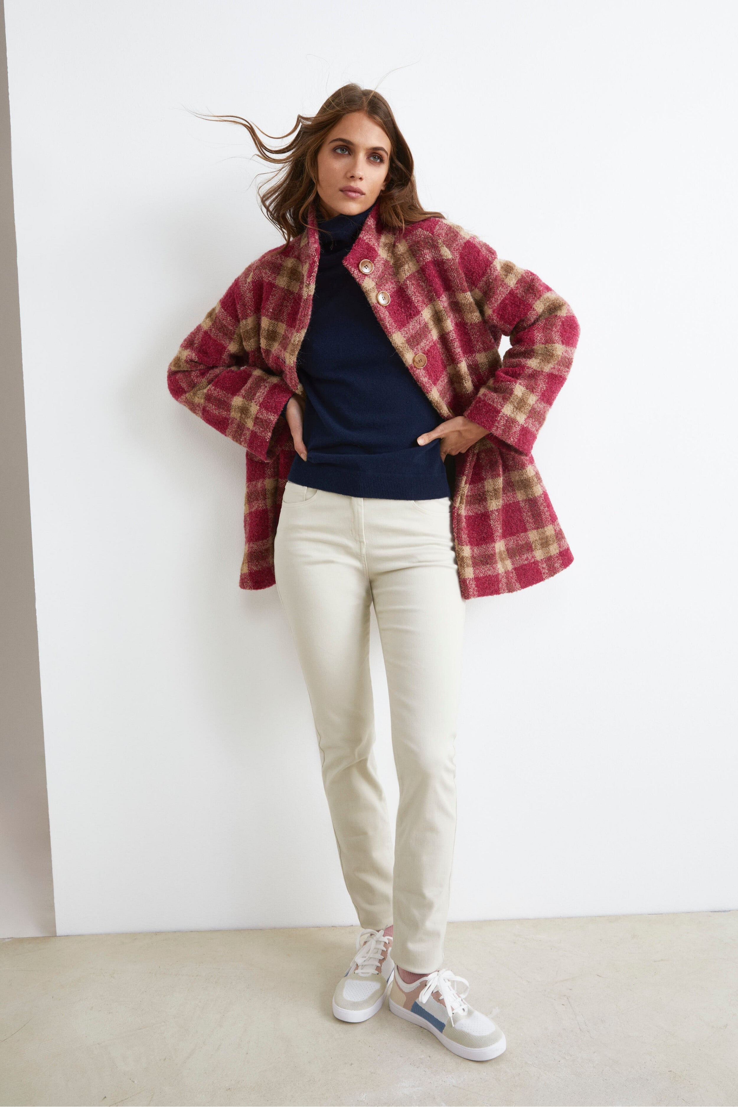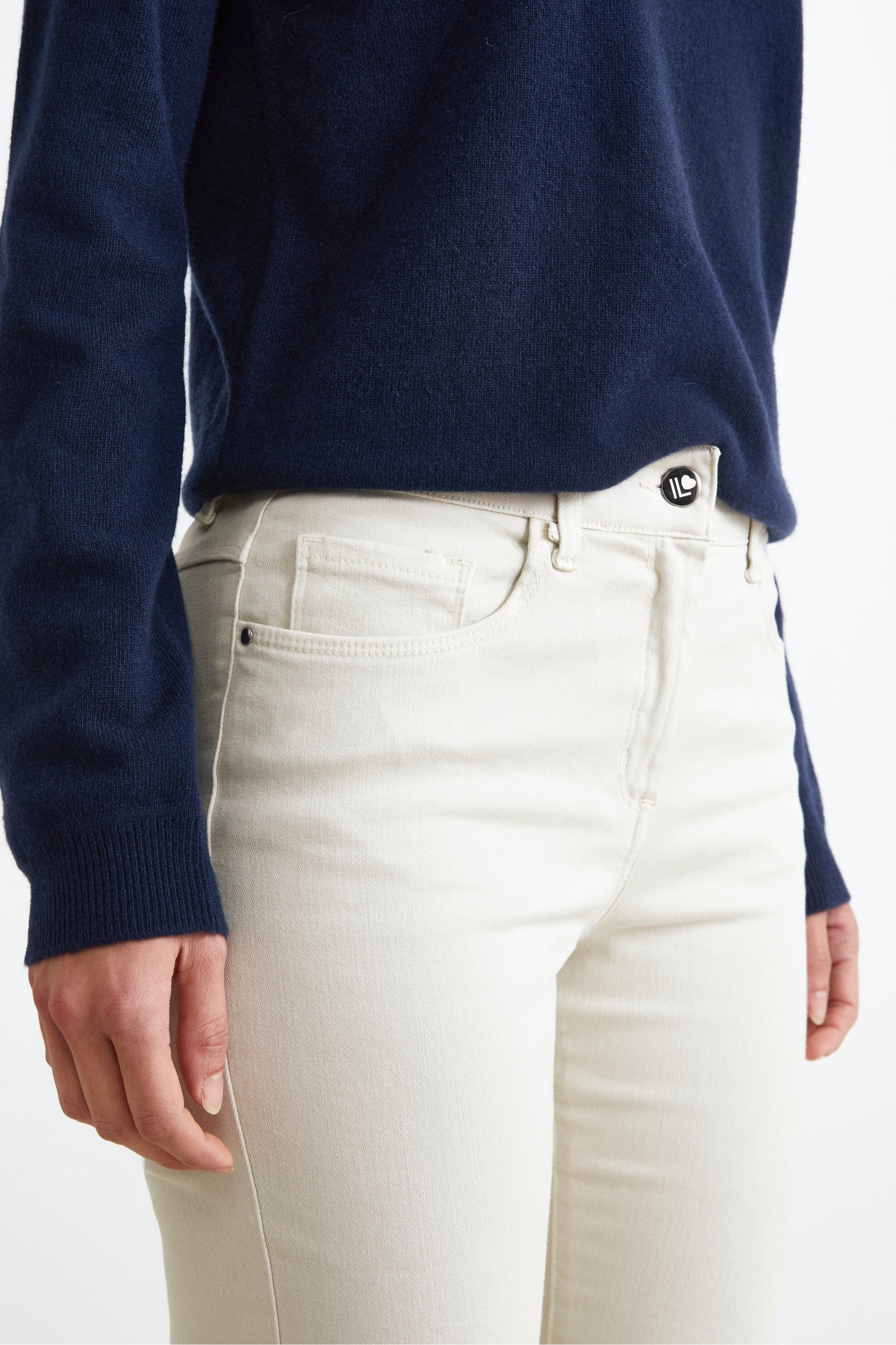 Pantaloni stretch cinque tasche, realizzati in tessuto Drill Superstretch, offrono il perfetto equilibrio tra resistenza e stile. Con un taglio a gamba dritta e una vestibilità slim, questi pantaloni da donna offrono un look moderno e versatile, ideale per ogni occasione. Le cinque tasche aggiungono un tocco casual e pratico, mentre la chiusura frontale con un bottone assicura una finitura pulita e raffinata. Parte della raffinata collezione IL Lanificio e ralizzati in Italia, questi pantaloni rappresentano l’eccellenza del made in Italy. Perfetti sia per outfit casual che più formali. Provali con una camicia bianca e delle sneakers per un look rilassato, oppure abbinali a un blazer e mocassini per un tocco più elegante e sofisticato. La modella è alta 177 cm e indossa la taglia 42.