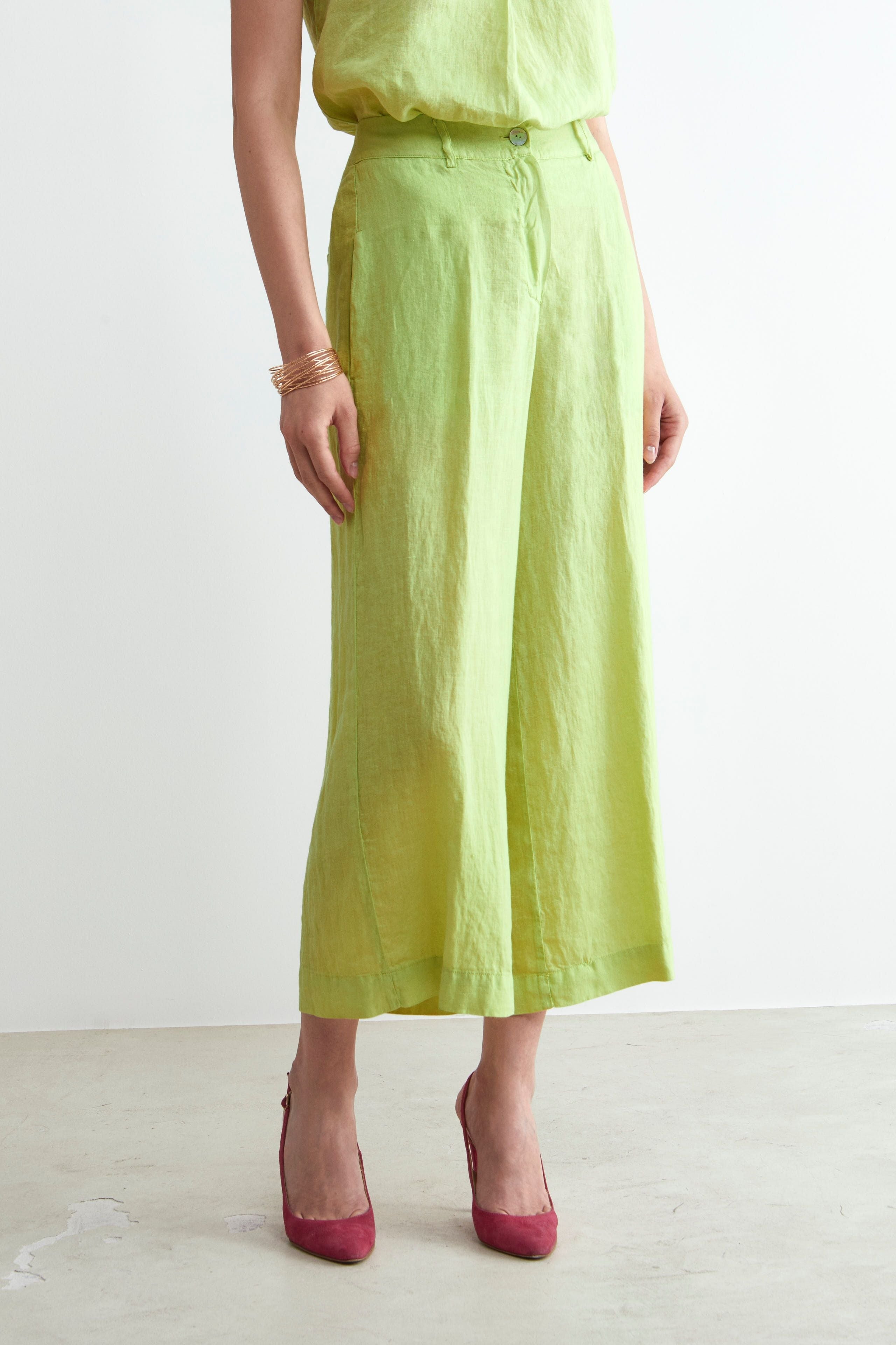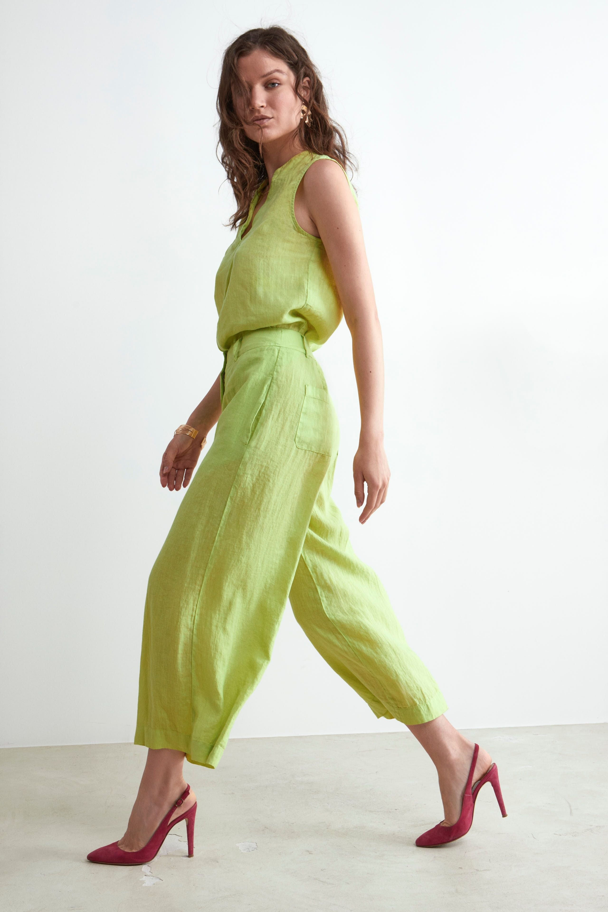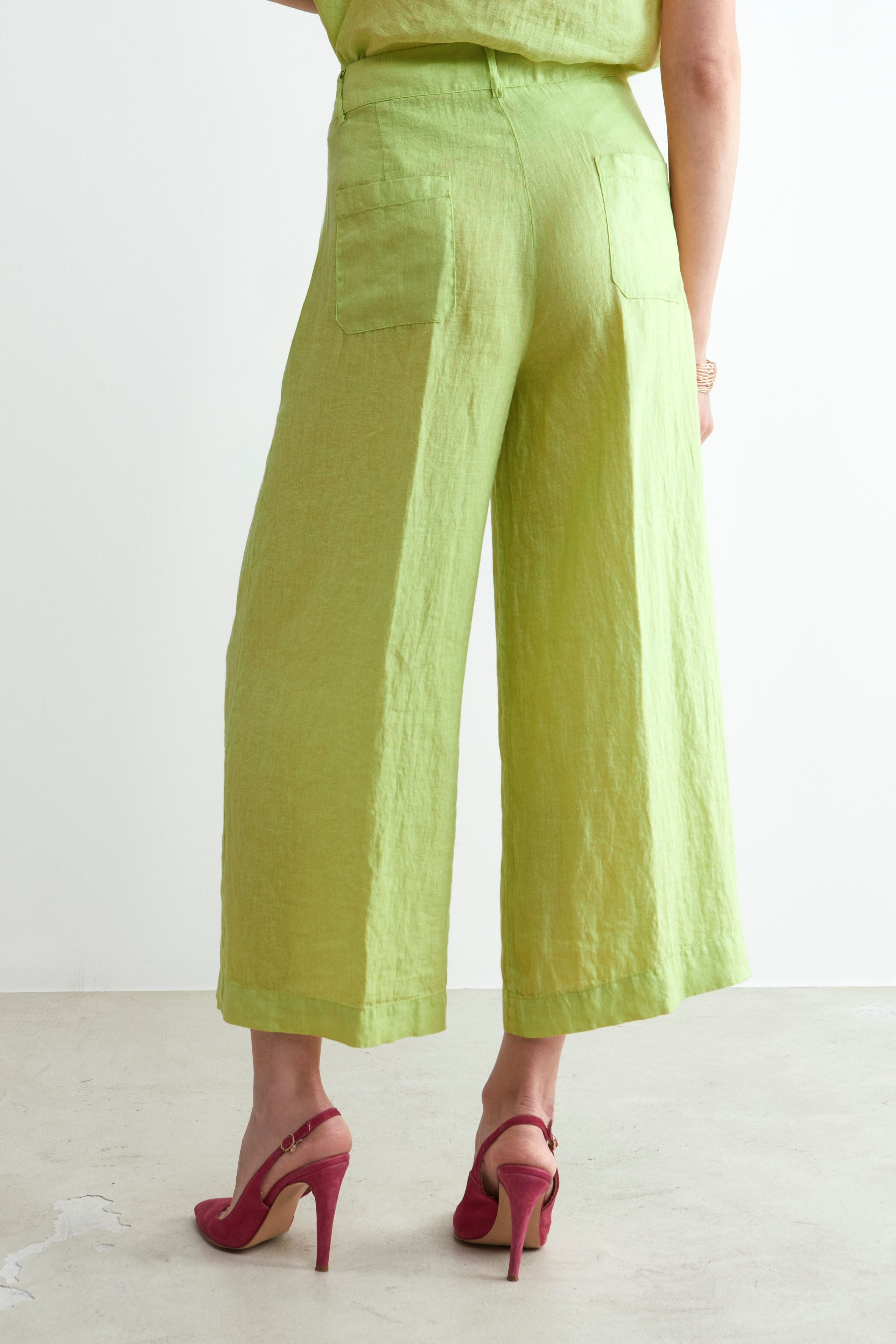 LIMEPantalone ampio in puro lino con pinces frontali. Realizzato con chiusura con bottone e zip, cintura con passanti e pratiche tasche applicate posteriori. Taglio leggermente cropped, lunghezza al polpaccio. Pantalone di lino ideale per look più sportivi. Made in Italy. La modella è alta 177 cm e indossa la taglia 40.