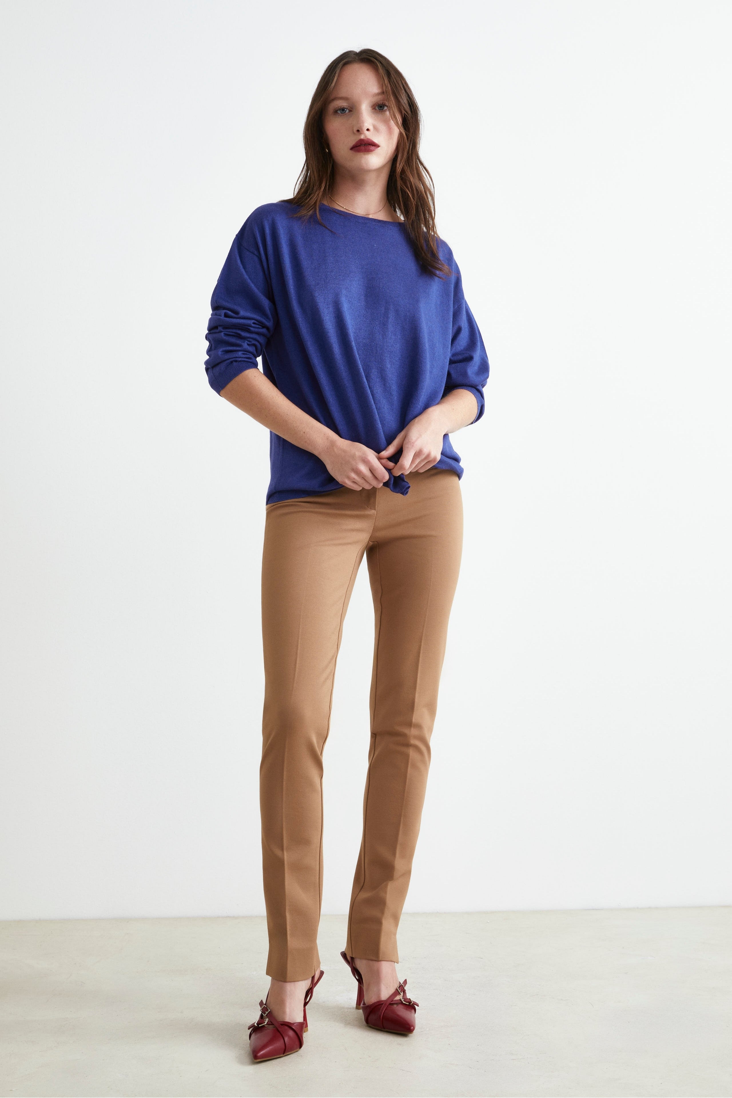 Pantalone in jersey punto milano dal taglio slim e linee asciutte. Realizzato con chiusura con zip nascosta e bottone, cintura con passanti, tasche a filetto orizzontali sul fronte e spacchetti sul fondo. Ideali da indossare di giorno con una maglia morbida o abbinato al blazer in coordinato. Made in Italy. La modella è alta 170 cm e indossa la taglia 40.