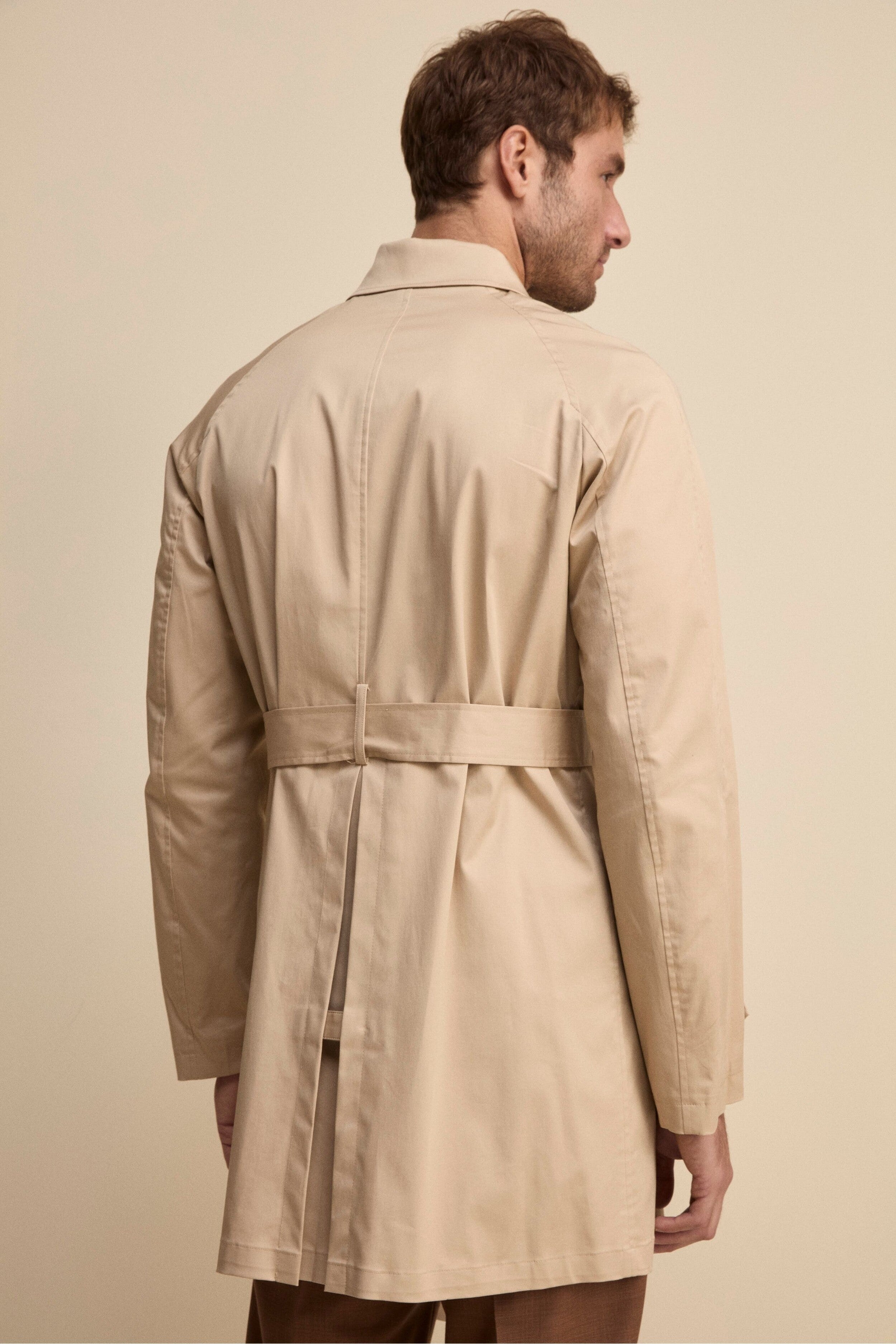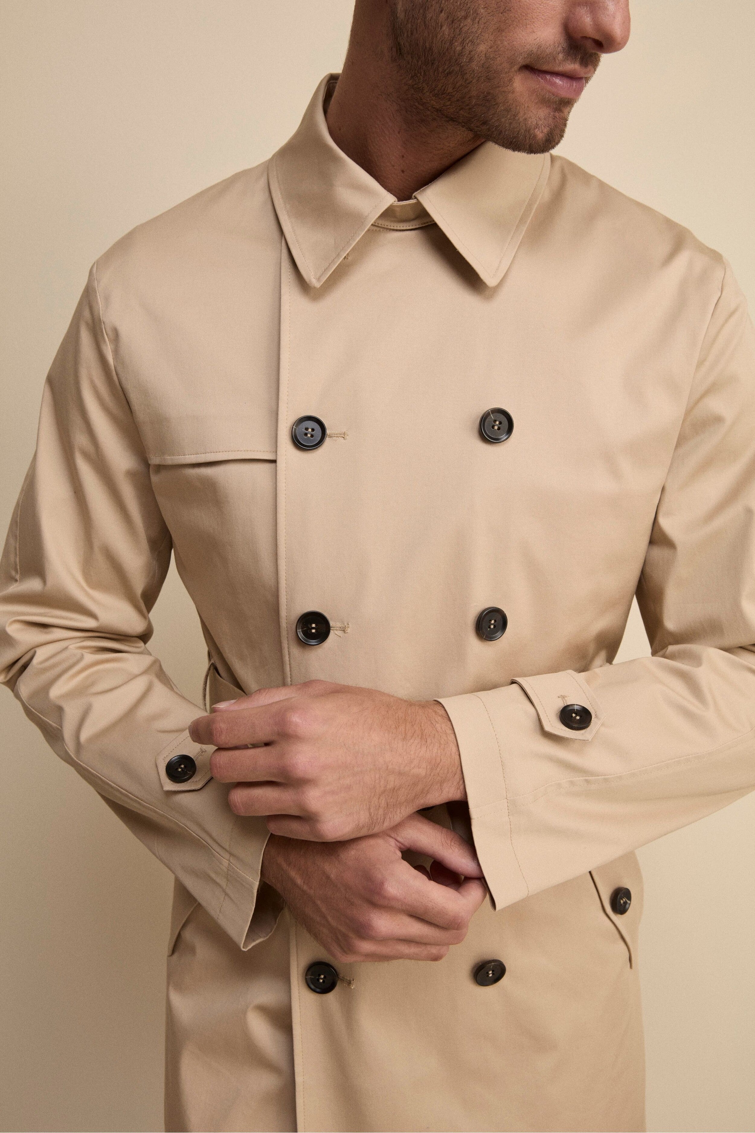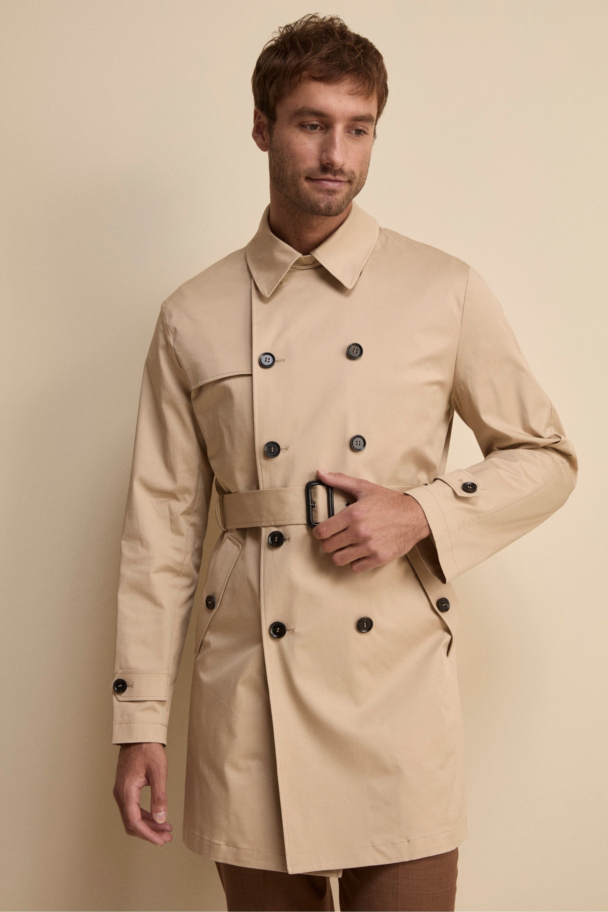 BEIGEUn’icona senza tempo rivisitata con dettagli funzionali ed eleganti. Questo trench midi doppiopetto con cintura da uomo, con lunghezza ai fianchi, offre un perfetto equilibrio tra stile e praticità. Il collo classico con cinturino e bottone permette di regolarne la chiusura per una protezione extra nei giorni più freschi. La chiusura frontale a bottoni, insieme alla cintura in vita, enfatizza la silhouette e aggiunge un tocco sartoriale.Le tasche con pattina e bottoni assicurano funzionalità e raffinatezza, mentre le mostrine ai polsi completano il design con un dettaglio distintivo. Lo spacco singolo posteriore garantisce libertà di movimento e comfort in ogni occasione. Il modello è alto 189 cm e indossa la taglia 50.