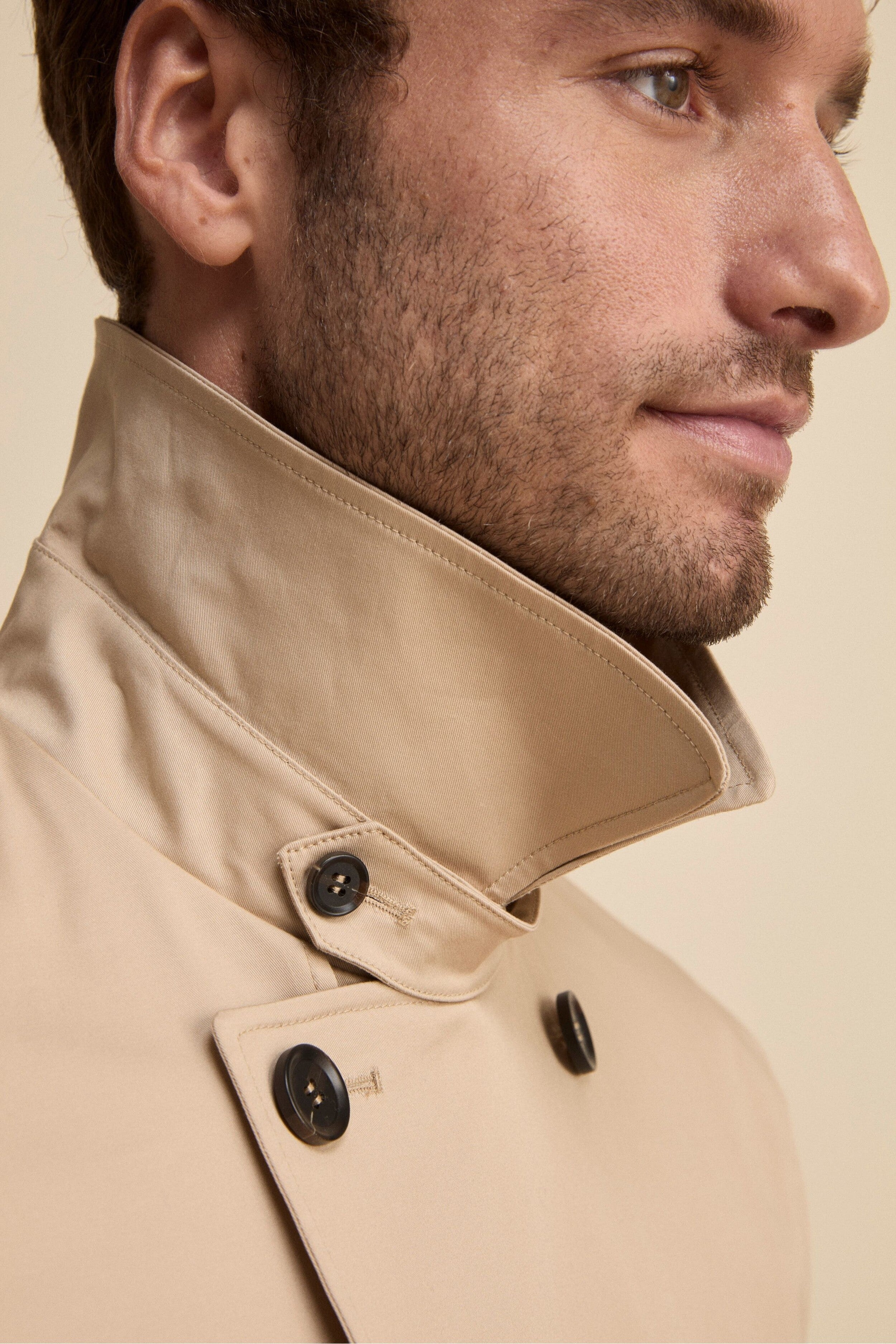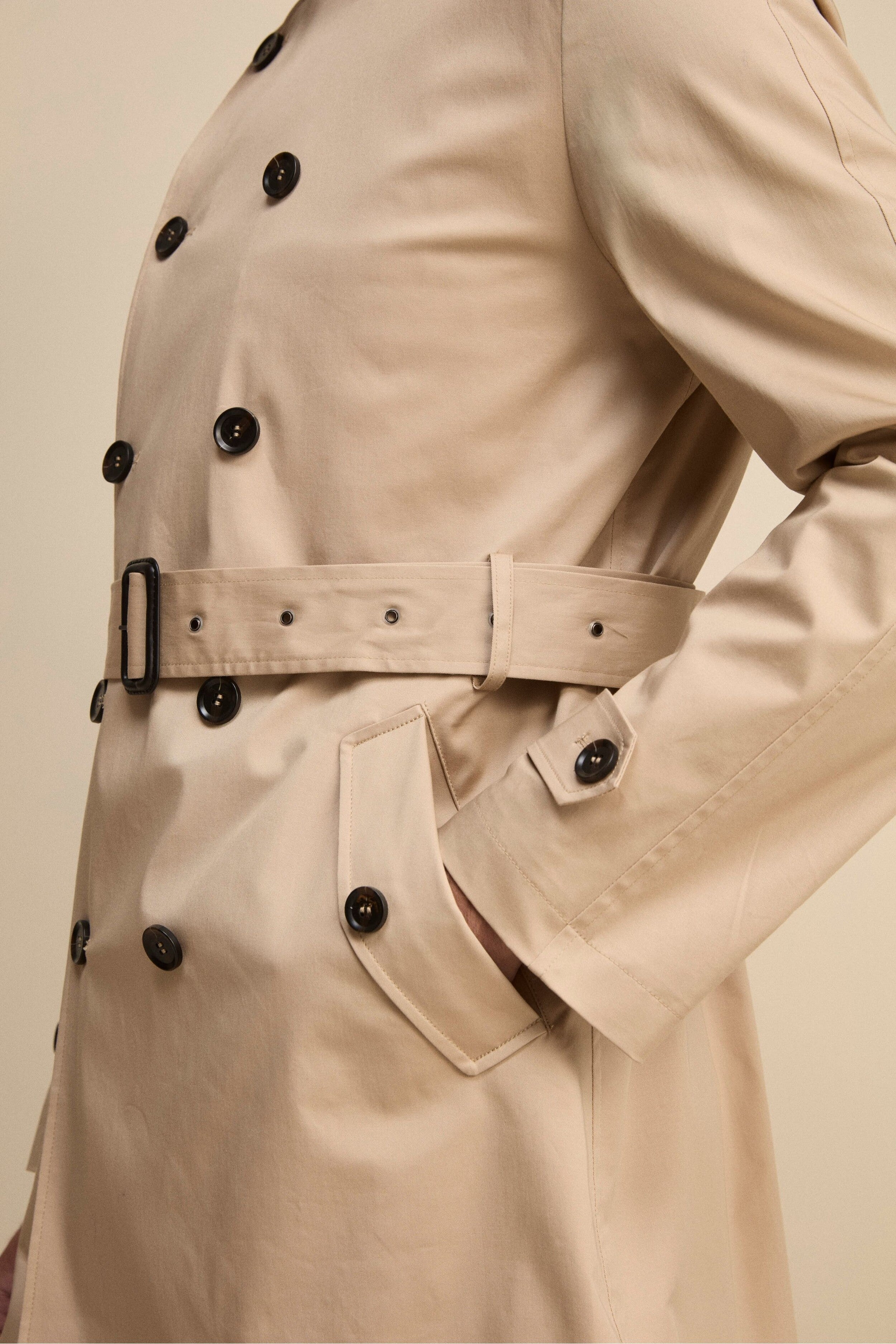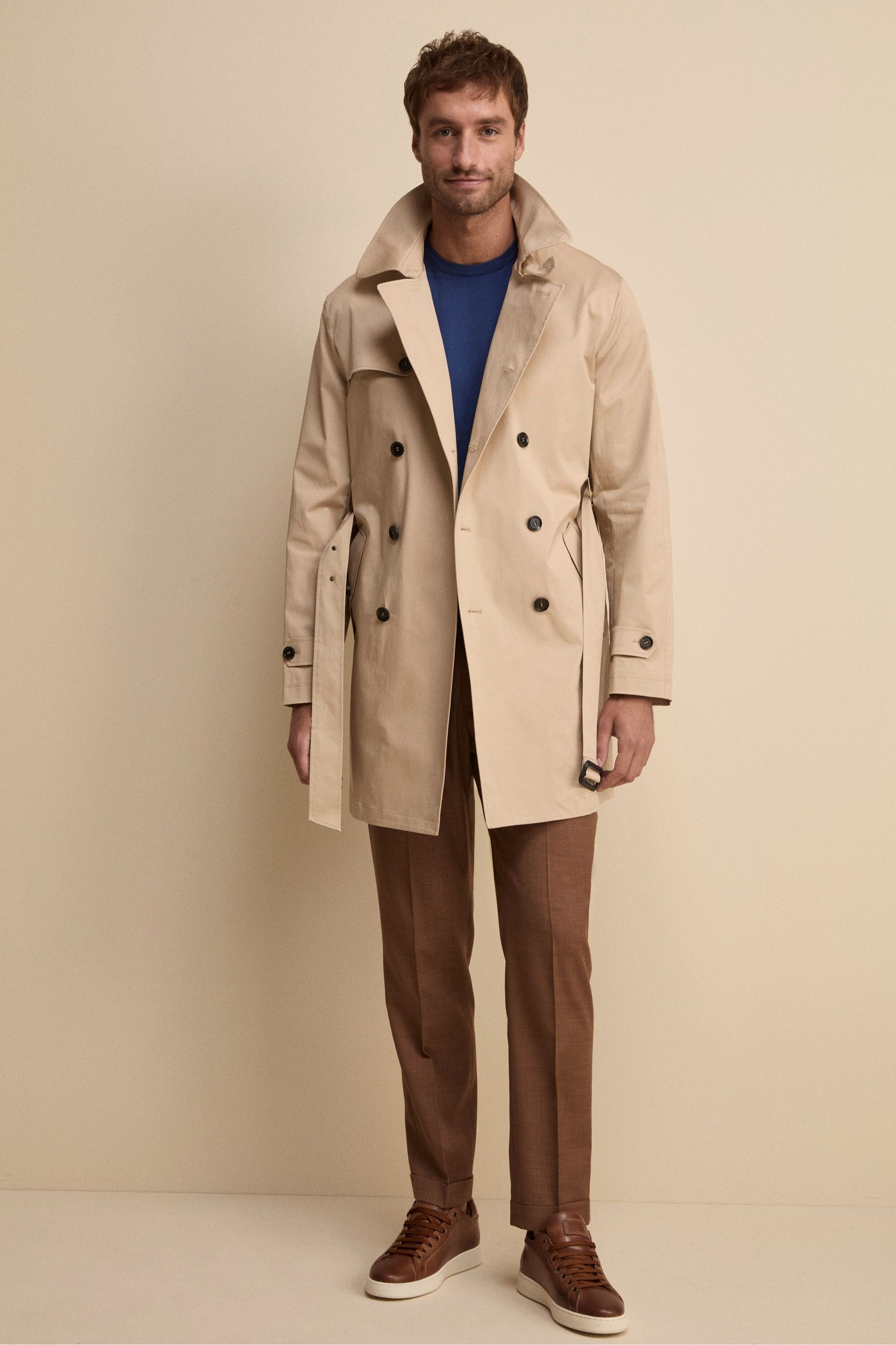 BEIGEUn’icona senza tempo rivisitata con dettagli funzionali ed eleganti. Questo trench midi doppiopetto con cintura da uomo, con lunghezza ai fianchi, offre un perfetto equilibrio tra stile e praticità. Il collo classico con cinturino e bottone permette di regolarne la chiusura per una protezione extra nei giorni più freschi. La chiusura frontale a bottoni, insieme alla cintura in vita, enfatizza la silhouette e aggiunge un tocco sartoriale.Le tasche con pattina e bottoni assicurano funzionalità e raffinatezza, mentre le mostrine ai polsi completano il design con un dettaglio distintivo. Lo spacco singolo posteriore garantisce libertà di movimento e comfort in ogni occasione. Il modello è alto 189 cm e indossa la taglia 50.